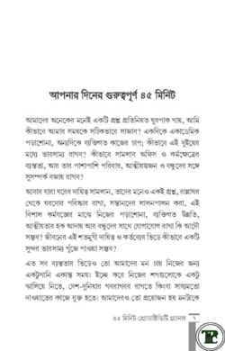 ৪৫ মিনিট প্রোডাক্টিভিটি প্ল্যানার বইটি সময় ব্যবস্থাপনা ও ব্যক্তিগত উন্নয়নের জন্য একটি বাস্তবভিত্তিক গাইড, মাত্র ৪৫ মিনিট ব্যয় করে আপনি হতে পারেন একজন সফল মানুষ। শুনতে অবাক লাগছে? অবাক লাগলেও কথাটা সত্য। মানুষ মাত্রই সফল হতে চায়, কিন্তু জীবনের কঠিন পরিস্থিতিগুলো মাঝেমধ্যেই আমাদের পথ থামিয়ে দেয়। ফলে সিদ্ধান্তহীনতা কিংবা ভুল সিদ্ধান্তের কারণে জীবনযাত্রা এক নেতিবাচক পরিস্থিতির মুখে আটকে যায়। সাফল্যের মূল চাবিকাঠি হলো সব পরিস্থিতিতে নিজেকে ইতিবাচক রাখা। যদি একজন মানুষ জীবনের প্রতিটি বাঁকে ইতিবাচক মানসিকতা ধরে রাখতে পারে, তবে তার পক্ষে সফলতার পথে এগিয়ে যাওয়া অনেক সহজ হয়। পজিটিভ মাইন্ডসেট কেবল মানসিক শান্তি দেয় না, বরং কঠিন সময়েও সঠিক পথ খুঁজে পেতে সাহায্য করে। আপনার জীবনের প্রতিদিনের মাত্র ৪৫ মিনিট সময়কে কীভাবে কাজে লাগিয়ে ইতিবাচক মানসিকতা অর্জন করবেন এবং নিজেকে একজন প্রোডাক্টিভ মানুষ হিসেবে গড়ে তুলবেন, তা বিস্তারিত জানতে পড়ুন মাওলানা ইফতেখার রচিত ‘৪৫ মিনিট প্রোডাক্টিভিটি প্ল্যানার’ বইটি। এটি আপনার জীবনকে নতুন করে সাজাতে একটি কার্যকর গাইড হিসেবে কাজ করবে।