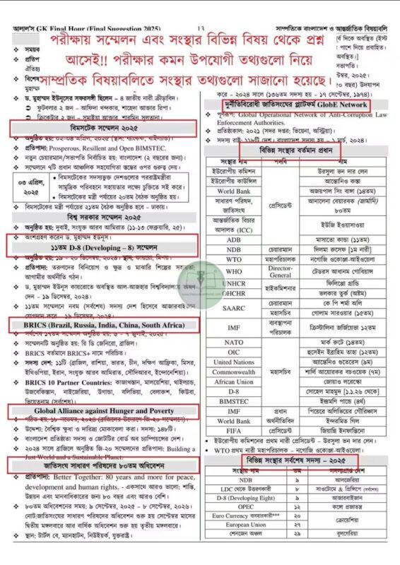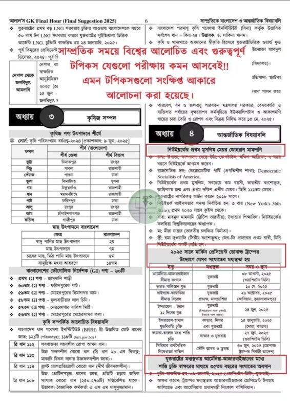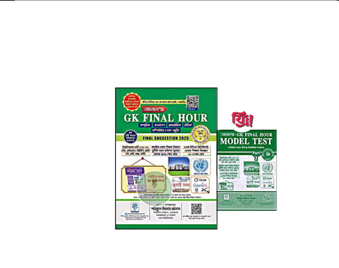 ঢাকা বিশ্ববিদ্যালয় ও মেডিকেল ভর্তি পরীক্ষার এই শেষ সময়ে ৮০০-৯০০+ পৃষ্ঠার বইগুলো না পড়ে ১৬০ পৃষ্ঠার সাধারণ জ্ঞানের সাজেশন বই ‘‘আলাল’স জিকে ফাইনাল আওয়ার – 2025 (Final Suggestion)” ভাল করে শেষ করে ফেলো। ২ বার রিভিশন দাও কথা দিলাম সাধারণ জ্ঞানে ৩০ এর মধ্যে কনফিডেন্টলি ২৪-২৬ পাবে। মানে ১৬০ পৃষ্ঠার “আলাল’স জিকে ফাইনাল আওয়ার” বই থেকে ২৫+ উত্তর করতে পারবে। এবার সিদ্ধান্ত তোমার! সর্বশেষ ১০ বছর ধরে একক হুবহু কমনের দিক বাজারের সর্বাধিক কমনপ্রাপ্ত সাধারণ জ্ঞানের সাজেশন বই। আস্থা রেখে শেষ করো কথা দিলাম ভাল পরীক্ষা দিবে।
