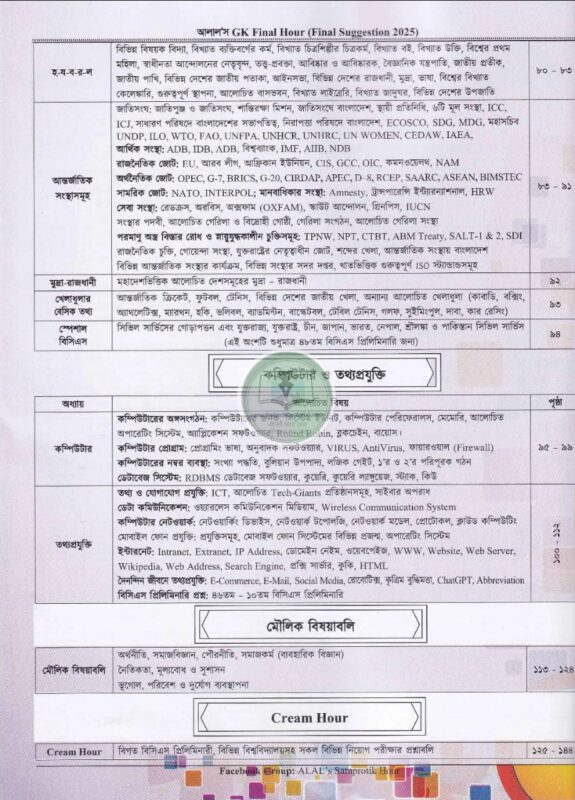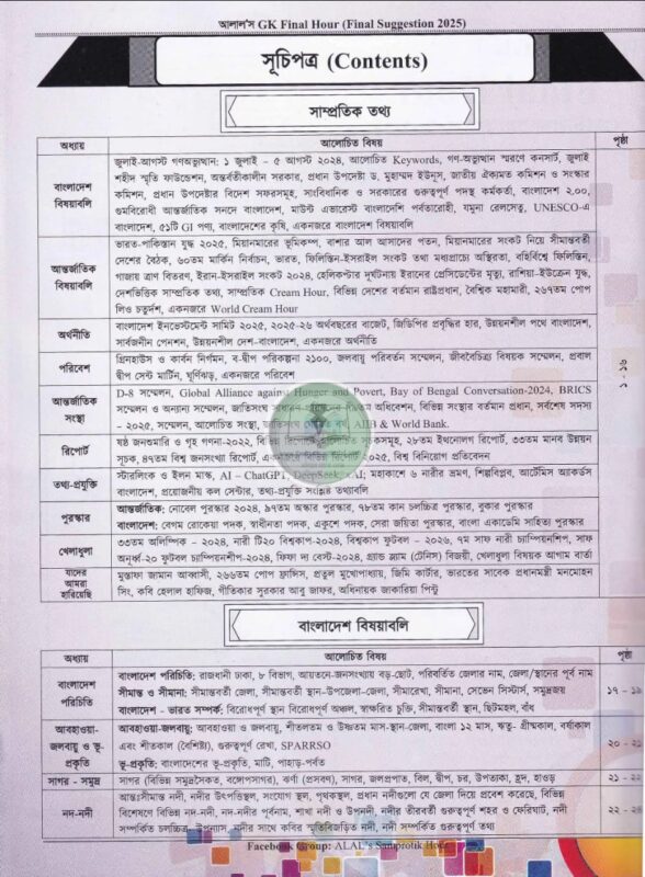 আলাল’স GK Final Hour (Final Suggestions 2025) এর ১২তম সংস্করণ (৪ জুন, ২০২৫) প্রকাশিত হয়েছে। বইটিতে সংযোজন রয়েছে – চিত্রভিত্তিক বাংলাদেশ ও আন্তর্জাতিক তথ্য সংযোজন