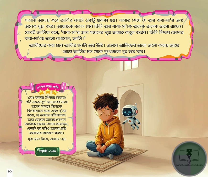 শিশুদের জগতটা বিস্ময়ে ঠাসা। তাদের এই নির্মল সময়েই হৃদয়ে গেঁথে দেওয়া প্রয়োজন আমাদের মহান রবের অসীম কুদরত আর আধুনিক বিজ্ঞানের বিস্ময়কর সব সেতুবন্ধন। কেমন হয় যদি একটি বুদ্ধিমান রোবট আর এক ছোট্ট সোনামণির বন্ধুত্বের গল্পে গল্পে আপনার শিশু শিখে নেয় জীবনের দারুণ সব শিক্ষা? ঠিক এই ভাবনা থেকেই সাজানো হয়েছে “আলি ও একটি আশ্চর্য রোবট” বইটি। বইটির প্রধান চরিত্র ‘আলি’ এবং তার বন্ধু রোবট ‘আলিফ’। দুই বন্ধুর মজার সব কাণ্ডকীর্তি আর রোমাঞ্চকর অভিযানের মধ্য দিয়ে শিশুরা শিখবে আল্লাহর সৃষ্টির রহস্য, বিজ্ঞানের বিস্ময় আর ইসলামের সুন্দর সব শিষ্টাচার। শিশুদের মনস্তত্ত্ব বুঝে অত্যন্ত চমৎকার ঢঙে গল্পগুলো বলা হয়েছে, যা তাদের কল্পনার জগতকে রঙিন করবে। শুধু গল্পই নয়, প্রতিটি পাতায় রয়েছে প্রাণবন্ত ও চোখ জুড়ানো সব ইলাস্ট্রেশন, যা শিশুদের বই পড়ার প্রতি আগ্রহী করে তুলবে। আমরা আশাবাদী, ছোটদের কাছে “আলি ও একটি আশ্চর্য রোবট” বইটি হয়ে উঠবে আনন্দ আর শিক্ষার এক প্রিয় নাম। ইনশা আল্লাহ।