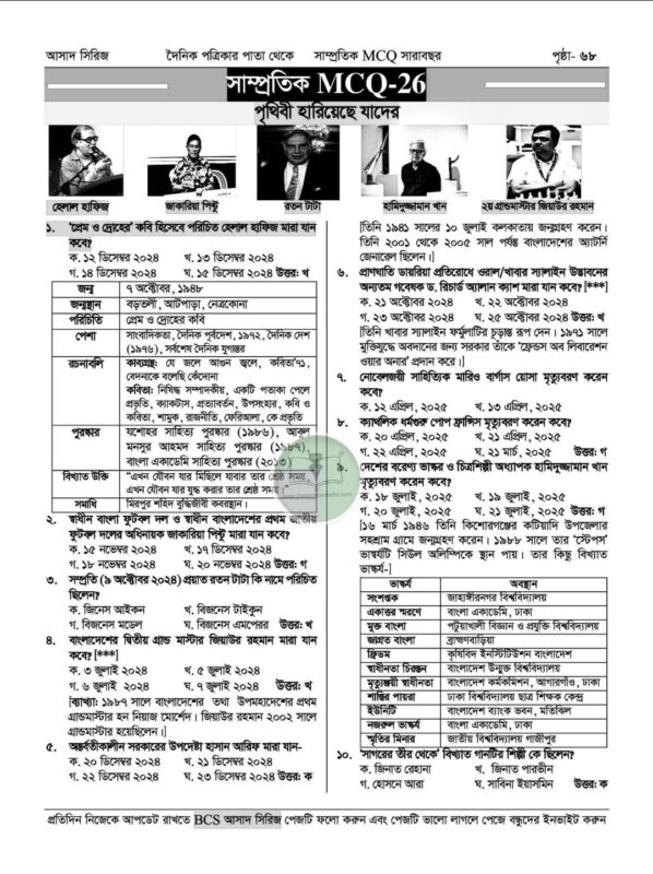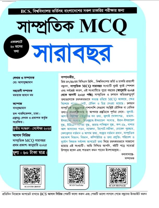 সকল প্রতিযোগিতামূলক পরীক্ষায় সর্বোচ্চ কমনপ্রাপ্ত সাম্প্রতিক সংকলন। (জানুয়ারি ২০২৪- আগস্ট ২০২৫ পর্যন্ত অতিগুরুত্বপূর্ণ সাম্প্রতিক তথ্য)শুধুমাত্র ৪৭তম বিসিএস প্রার্থী ও অন্যান্য জব প্রত্যাশীদের জন্য বিশেষভাবে রচিত আসাদ সাম্প্রতিক MCQ সারাবছর বইটি সারা দেশে পাওয়া যাচ্ছে। বাংলাদেশের প্রথম সাম্প্রতিক এর ব্যতিক্রমধর্মী একটি বই, বিশ্ববিদ্যালয় ভর্তি পরীক্ষার্থী ও জব প্রত্যাশীরা দ্রুত বইটি সংগ্রহ করুন।।