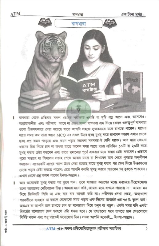 ATM বইতে বাংলা বিরচন অংশ সহজে মনে রাখার পদ্ধতি, প্রতিটি শব্দের ব্যাখ্যা, কোনটির অর্থ কেন হলো, কেন হলো না তার সবই গল্প, কবিভা ও চিত্রাকারে উপস্থাপিত হয়েছে, যা দু-একবার পড়লেই। আপনার মনে থাকবে। অন্যান্য বইয়ের মতো বারবার পড়ে মুখস্থ করতে হবে না। আপনাদের সহজে নদে রাখার প্রয়োজনীয়তা অনুভব করেই ATM এর এই প্রয়াস। বিরচন অংশ পড়তে বসলেই ভয়, অলসতা ও একঘেয়েমি কাজ করে। বিরচন অংশ পড়তে গেলেই মা। হয়, এই বিরক্তিকর টপিকগুলো কীভাবে পড়ব আর কীভাবেই বা মনে রাখবা মুখস্থ অংশ যে কতটা তৃপ্তি সহকারে পড়া যায় তা ATM না পড়লে বুঝতেই পারাবেন না। ATM আপনার মধ্যে বিরক্তির ছাপ বা একঘেয়েমি আসতে দিবে না, বরং আনন্দের সাথে বিরচন অংশ পড়বেন এবং দীর্ঘদিন যাবৎ মনে রাখাতে পারবেন। “ATM বাংলা এক টানা মুখস্থ” বইতে প্রতিটি অধ্যায়ের চমৎকার উপস্থাপনা আপনাকে মুগ্ধ করবে এবং আপনি AIM এর প্রেমে পড়তে বাধ্য হবেন, ইনশাআল্লাহ।