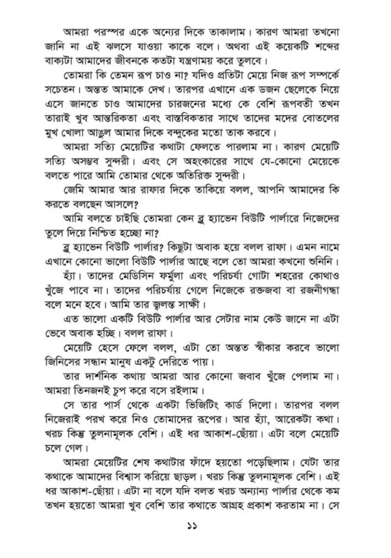 “ব্লু হ্যাভেন বিউটি পার্লার” পৃথিবীতে এমন কিছু ব্যপার বা রহস্য থাকে যেটা নিয়ে কোন প্রশ্ন করা যায় না। প্রশ্ন করলেও কোন উত্তর পাওয়া যায় না। কেন হলো এমন? কেন ঘটলো? কি কারণে? এমনটা তো হবার কথা ছিল না। এসব কি? এত নিষ্ঠুর মানুষ? অসম্ভব। মানুষেরা তো এমন হতে পারে না। কিন্তু কিছু কিছু দৃশ্য বা প্রেক্ষাপট এসব কথার ধারও ধারে না। এই সকল বীভৎস পরিস্থিতি বা মুহূর্তগুলো তার মত করে সৃষ্টি হয় এবং এর প্রতিকার করাও সম্ভব হয় না। পরিস্থিতিটা তার উদ্দেশ্য সফল করে এবং তখনই সে ক্ষান্ত হয়। সে যখন চলে যায় পিছনে ফেলে যায় কিছু মর্মান্তিক ধ্বংসাবশেষ। তখন শুধুমাত্র পৃথিবীর সকল দুঃখ কষ্ট যন্ত্রণা আর্তনাদ বীভৎস মৃত্যু যন্ত্রণা একসাথে হয়ে কোন দানবের মুখের মধ্যে থেকে যেন গোঙ্গানীর শব্দের মত মানুষের মুখের মধ্যে থেকে বের হয়ে আসে। এই গল্পে যে খুনগুলোর ব্যপারে কথা বলা আছে মানুষ মূলত এমনভাবে খুনগুলো করে না। কিংবা আরেকটু স্পষ্ট করে বলা যায় এমন কারণে কেউ কাউকে নৃশংসভাবে খুন করে না। কিন্তু মানুষ তো মানুষকে খুন করে। নাকি এ কথায় কেউ অস্বীকার করবেন? তাই মানুষ যেহেতু অপর একটি মানুষকে খুন করতে গিয়ে কোন প্রকার দ্বিধা করে না। গ্লানিতে ভোগে না। একটি খুন করে এসে সে সুন্দর একটি ঘুম দেয় এবং তার চাইতেও সুন্দর একটি স্বপ্ন দেখে সেখানে খুনের কারণ বা দৃশ্যগুলো খুব একটা চিন্তার কারণ হয়ে দাঁড়ায় না।
