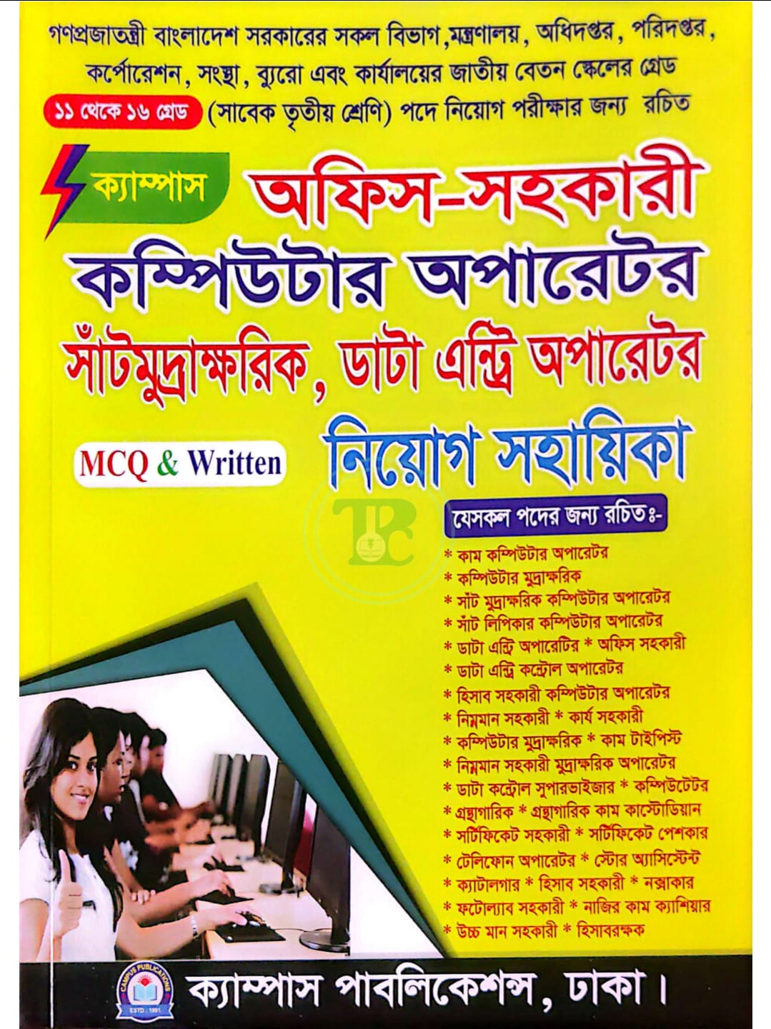 ক্যাম্পাস অফিস-সহকারী কম্পিউটার অপারেটর সাঁটমুদ্রাক্ষরিক ডাটা এন্ট্রি অপারেটর নিয়োগ সহায়িকা (এমসিকিউ, লিখিত ও ভাইবা) বইটি গণপ্রজাতন্ত্রী বাংলাদেশ সরকারের সকল বিভাগ, মন্ত্রণালয়, অধিদপ্তর, পরিদপ্তর, কর্পোরেশন, সংস্থা, ব্যুরো এবং কার্যালয়ের জাতীয় বেতন স্কেলের গ্রেড ১১ থেকে ১৬ গ্রেড (সাবেক তৃতীয় শ্রেণি) পদে নিয়োগ পরীক্ষার জন্য রচিত। কাম কম্পিউটার অপারেটর, কম্পিউটার মুদ্রাক্ষরিক, সাঁট মুদ্রাক্ষরিক কম্পিউটার অপারেটর, সাঁট লিপিকার কম্পিউটার অপারেটর, ডাটা এন্ট্রি অপারেটির, অফিস সহকারী, ডাটা এন্ট্রি কন্ট্রোল অপারেটর, হিসাব সহকারী কম্পিউটার অপারেটর, নিম্নমান সহকারী, কার্য সহকারী, কম্পিউটার মুদ্রাক্ষরিক, কাম টাইপিস্ট, নিম্নমান সহকারী মুদ্রাক্ষরিক অপারেটর, ডাটা কন্ট্রোল সুপারভাইজার, কম্পিউটেটর, গ্রন্থাগারিক, গ্রন্থাগারিক কাম কাস্টোডিয়ান, সর্টিফিকেট সহকারী, সর্টিফিকেট পেশকার, টেলিফোন অপারেটর, স্টোর অ্যাসিস্টেন্ট, ক্যাটালগার, হিসাব সহকারী, নক্সাকার, ফটোল্যাব সহকারী, নাজির কাম ক্যাশিয়ার, উচ্চ মান সহকারী, হিসাবরক্ষক।
