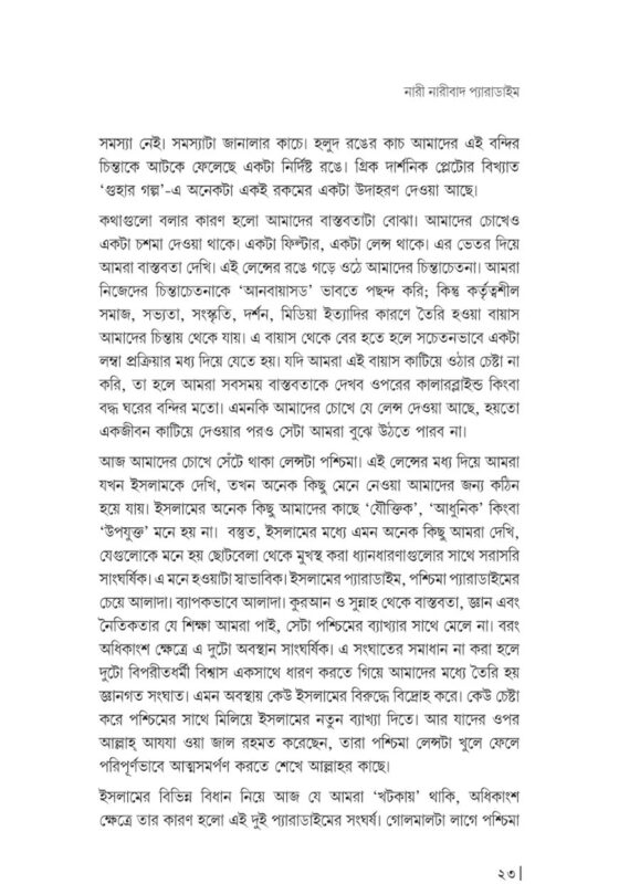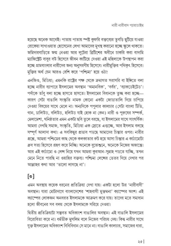 আর মেয়ে হলে তো কথাই নেই। মেয়ে পর্দা করবে কিন্তু তাকে দেখতে নায়িকার মতো হতে হবে; মেয়ের বাপভাই থাকতে হবে এবং তাদের যথেষ্ট পয়সাওয়ালা হতে হবে; মেয়ে ছেলের পরিবার এবং তাকে উভয়কেই চমৎকৃত করতে হবে।
