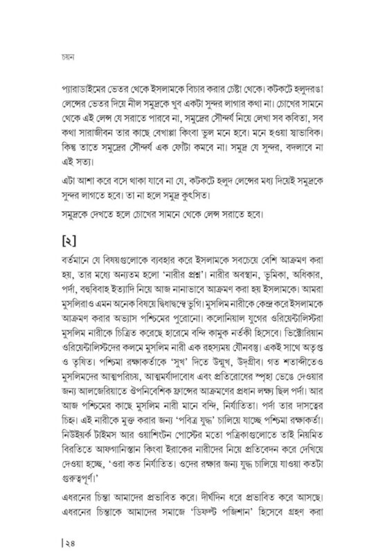 … এই মডারেট মুসলিমদের মধ্যে এমন লোকও আছেন যারা মেয়েদের গা থেকে ওড়না টেনে খুলে ফেলেছেন, মেয়েদের বোরকা নিয়ে পুড়িয়ে ফেলেছেন, মেয়েদের ঘরবন্দী করে রেখেছেন কেবল এরা সভ্য সমাজে চলার উপযোগী নয় বলে। অনেক ছেলেই বেয়াদব হয়ে যায় শুধু বাবা, চাচা কিংবা দাদার আগে দাড়ি রাখার কারণে! বিয়ের সময় এদের জন্য পছন্দমতো মেয়ে খুঁজে বের করা মুশকিল হয়ে যায়; কারণ মেয়ে পরিবারের পছন্দ হলে ছেলের পছন্দ হয় না, ছেলের পছন্দ হলে পরিবারের পছন্দ হয় না। চয়ন-Choyon