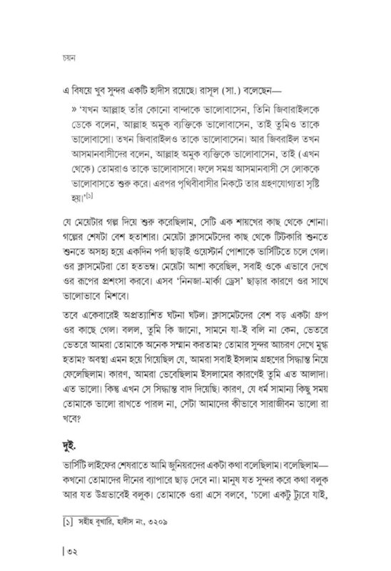 “চয়ন-Choyon” শুধুই সামাজিক সম্মানের কারণে, নিজের আত্মতৃপ্তির কারণে, পড়াশোনা করেছি বলেই প্রয়োজনীয় ইসলামি জ্ঞানে পিছিয়ে থেকে, নিজের সন্তানদের টিভি আর কাজের মানুষের কাছে বড় হতে দিয়ে, আল্লাহ অসন্তুষ্ট হন এমন পরিবেশে বাইরে কাজ করতে যাওয়াটা কি আমাদের দুনিয়া বা আখিরাতে কল্যাণ বয়ে আনতে পেরেছে? সম্মান কি সত্যিই আমরা পেয়েছি এর মাধ্যমে? অফিসে উচ্চপদে চাকরি করেও ঘরে ফিরে শারীরিক বা মানসিক নির্যাতনের শিকার হওয়ার চিত্র তো অহরহ দেখা যায়! তা যদি নাও হয়, অনেকেই সন্তানদের যথেষ্ট সময় দিতে না পারার মনোকষ্টে ভোগেন। সেই সাথে নিয়ন্ত্রণহীন টিভি দেখে ও মায়ের সাহচর্য ছাড়া বড় হয়ে বাচ্চারা যে অসংখ্য ভুল জিনিস শিখছে, সেই বিপদ তো আছেই। তবুও সামাজিক মর্যাদার কথা ভেবে চাকরির মোহ কাটানো হয়ে ওঠে না আমাদের।