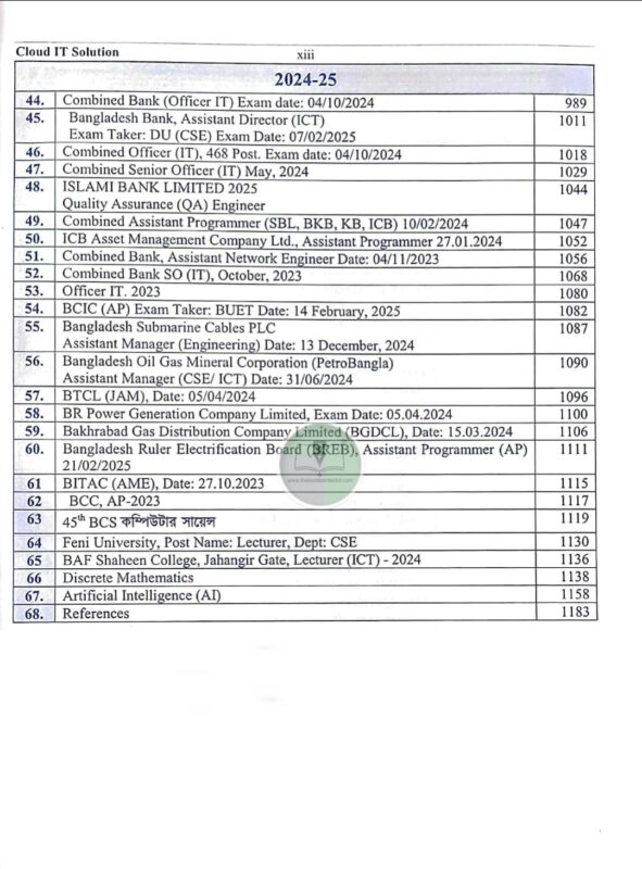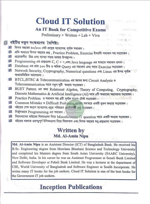 CLOUD IT SOLUTION (৪র্থ সংস্করণ) বইটি আইটি-ভিত্তিক সব ধরনের প্রতিযোগিতামূলক পরীক্ষার জন্য একটি পূর্ণাঙ্গ ও আপডেটেড সমাধান গ্রন্থ। বিগত বছরের সবচেয়ে বেশী প্রশ্নের সমাধান এবং একই প্রশ্ন বিভিন্ন সময় আসলেও তার সংক্ষিপ্ত এবং তথ্যবহুল সমাধান প্রদান করা হয়েছে। সাইড নোট, টীকা, গুরুত্বপূর্ণ প্রশ্ন বা অধ্যায় বিহ্নিত করা হয়েছে। বই ছাড়াও Internet থেকে অন্যান্য যে Topic গুলো আছে তা নিয়ে All important written Questions নামে অধ্যায় আলোচনা করা আছে। যেহেতু IT Exam এ কিছু প্রশ্ন রিপিট আছে তাই সকল প্রশ্ন এক সাথে করে “CLOUD IT SOLUTION” বই এর প্রথমে দেয়া হয়েছে। যেটি একটি পূর্নাঙ্গ সিলেবাস হিসেবে কাজ করবে। তাছাড়া প্রতি অধ্যায় টপিক ভিত্তিক বিগত বছরের প্রশ্ন, MCQ, Practice problem এবং Exercise আলোচনা করা হয়েছে। ফলে পড়া শেষে সমাধানের সুযোগ রয়েছে।