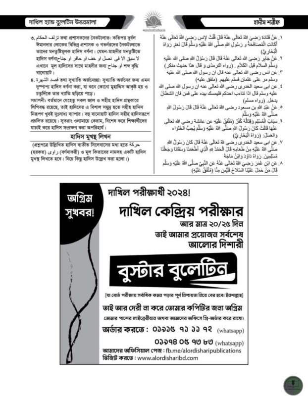 দাখিল ২০২৪ হ্যান্ড বুলেটিন উত্তরমালা দাখিল পরীক্ষার্থীদের জন্য একটি পূর্ণাঙ্গ ও নির্ভরযোগ্য সহায়ক গ্রন্থ। সাফল্যের আলোকিত ভোরে স্বাগতম! ধারাবাহিক সাফল্যের ২৩তম বৎসরে আলোর দিশারী পাবলিকেশন্স এর সুনামের সাথে অগ্রযাত্রা । আলহামদুলিল্লাহ! একটা গল্প দিয়ে শুরু করা যাক… রাস্তার ধারে ভিক্ষা করছিল এক ভিক্ষুক। একজন সহকর্মী পথচারী ভিক্ষুকের প্রতি দয়াপরবশ হয়ে একটা কাগজে লিখে দিলো-“আমি অন্ধ একজন মানুষ, বৃদ্ধ বয়সে কাজের ক্ষমতাও আমার নেই। তাই আমার অক্ষমতার জন্য আপনাদের সবার কাছে আমি সাহায্যপ্রার্থী।” লেখা দেখে সবাই সাহায্য করছে, তাতে অন্ধ বৃদ্ধের আর কথাগুলো বলতে হচ্ছে না বারবার। কয়েকদিন এভাবে কেটে গেলো। আরেক পথচারী এসে লেখাটা বদলে অন্য কাগজ সেখানে লাগিয়ে দিলো। তাতে অন্ধ ভিক্ষুকের রোজগার অনেক বেড়ে গেলো। অবাক বৃদ্ধ জানতে পারলো-নতুন কাগজটায় লেখা ছিল, “আজকের দিনটা অনেক সুন্দর অথচ আমি দেখতে পাচ্ছি না”। বন্ধুরা, দ্রুত বদলে যাওয়া এই পৃথিবীর সবচেয়ে বড় চ্যালেঞ্জ হচ্ছে সময়ের সাথে নিজেকে টিকিয়ে রাখা, সময়ের দাবী অনুযায়ী নিজেকে প্রস্তুত করা। আমাদের দেশের প্রেক্ষাপটে এই প্রস্তুতি বলতে আমরা বুঝি সামসময়িক শিক্ষাব্যবস্থায় নিজেদের শ্রেষ্ঠত্বের প্রমাণ দিয়ে অসংখ্য প্রতিযোগী থেকে নিজেকে আলাদা করে ফেলা। কাজটি জটিল, তবে অসম্ভব নয়। তাই প্রয়োজন নিজেকে যথাসময়ে তৈরি করে ফেলা। মনে রাখতে হবে, এই প্রস্তুতিতে তোমাকে যেমন সিলেবাস সম্পূর্ণ করতে হয়, তেমনি বুঝে নিতে হবে প্রশ্নকর্তার চিন্তা-ভাবনা এবং তোমার সাথে প্রতিদন্দ্বিতায় নামতে যাওয়া প্রতিযোগী বন্ধুদের প্রস্তুতি ও কৌশল সম্পর্কেও। আর এই কাজটিতেই তোমার পাশে থাকার অঙ্গীকার করে আসছে বাংলাদেশের মাদ্রাসা শিক্ষার আরেক দিকপাল, দীর্ঘ প্রায় দুই দশক থেকে নিরবচ্ছিন্ন সেবা দানকারী, স্বনামধন্য প্রকাশনা “আলোর দিশারী পাবলিকেশন্স”। আমাদের প্রকাশনাসমূহ তোমাদের বৃহৎ সিলেবাসকে শুধু সংক্ষিপ্তভাবেই উপস্থাপন করবে না, এসব প্রকাশনা থেকে তোমরা পাবে বছরজুড়ে বিভিন্ন দিক নির্দেশনা ও ব্যতিক্রমধর্মী উপস্থাপনার কৌশল। ‘সাফল্যের আলোকিত বিশ্ব তোমাকে দেখাতে’ এই স্লোগানকে সামনে রেখে দাখিল পরীক্ষার্থীদের জন্য তৈরি করা হল হ্যান্ড বুলেটিন উত্তরমালা। যার সংক্ষিপ্ততা তোমাদের গুরুত্বপূর্ণ বিষয়গুলো খুঁজে নিতে সাহায্য করবে। আমাদের প্রত্যাশা-তোমাদের সাফল্যময় জীবনের পরশে এ ধরণীতে হোক আরেকটি প্রসন্ন সোনালী সকালের উদয়। মহান মুক্তিযুদ্ধের চেতনাকে বুকে লালন করে তোমরা হয়ে যাও আগামীর বাংলাদেশসহ সমগ্র বিশ্বের সম্ভাবনাময় নেতৃত্ব। সফল হোক তোমাদের সকল প্রচেষ্টা। ‘আলোর দিশারী’র পথ নির্দেশনায় ও আলোকময় আশীর্