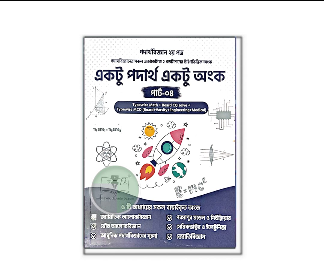 একটু পদার্থ একটু অংক (পার্ট-০৪) [New Edition] মোমেন তাজোয়ার মমিত রচিত পদার্থবিজ্ঞানের একটি পূর্ণাঙ্গ সহায়িকা, যা একাদশ–দ্বাদশ শ্রেণির শিক্ষার্থীদের জন্য বিশেষভাবে প্রণীত। এই বইয়ে পদার্থবিজ্ঞানের দ্বিতীয় পত্রের ৬টি গুরুত্বপূর্ণ অধ্যায়কে কেন্দ্র করে টাইপভিত্তিক গাণিতিক সমাধান ও প্রশ্নোত্তর উপস্থাপন করা হয়েছে। প্রতিটি অধ্যায়ে প্রায় ১০০টি করে বাছাইকৃত অংক দেওয়া আছে। অযথা অতিরিক্ত নয়, বরং বোর্ড এবং ভর্তি পরীক্ষার জন্য যথেষ্ট সংখ্যক সমস্যা নির্বাচন করা হয়েছে। “একটু পদার্থ একটু অংক (পার্ট-০৪)” এই বইয়ে আরও রয়েছে— টাইপভিত্তিক অংক, Advanced Maths (JEE টাইপ কঠিন অংক), টাইপভিত্তিক MCQ, Hand Written Solution, Practice CQ (উত্তরসহ) এবং Admission Question Bank। এর ফলে শিক্ষার্থীরা বোর্ড পরীক্ষার পাশাপাশি মেডিকেল, ইঞ্জিনিয়ারিং এবং বিশ্ববিদ্যালয় ভর্তি পরীক্ষার জন্যও কার্যকর প্রস্তুতি নিতে পারবে। পদার্থবিজ্ঞান বোঝা ও অনুশীলনের জন্য এটি HSC শিক্ষার্থীদের একটি নির্ভরযোগ্য সঙ্গী।