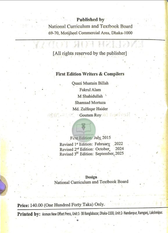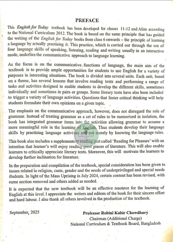 This English for Today textbook has been developed for classes 11-12 and Alim according to the National Curriculum 2012. The book is based on the same principle that has guided the writing of the English for Today books from class 6 onwards the principle of learning a language by actually practising it. This practice, which is carried out through the use of four language skills of speaking, listening, reading and writing usually in an interactive mode, underlies the communicative approach to language learning.