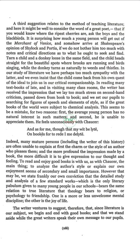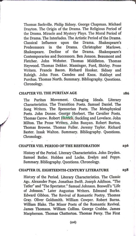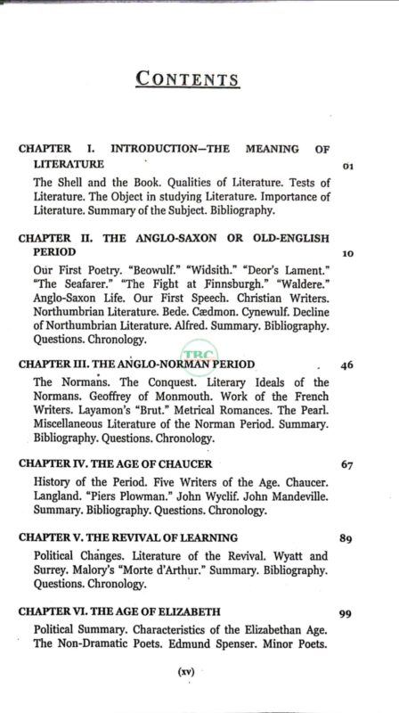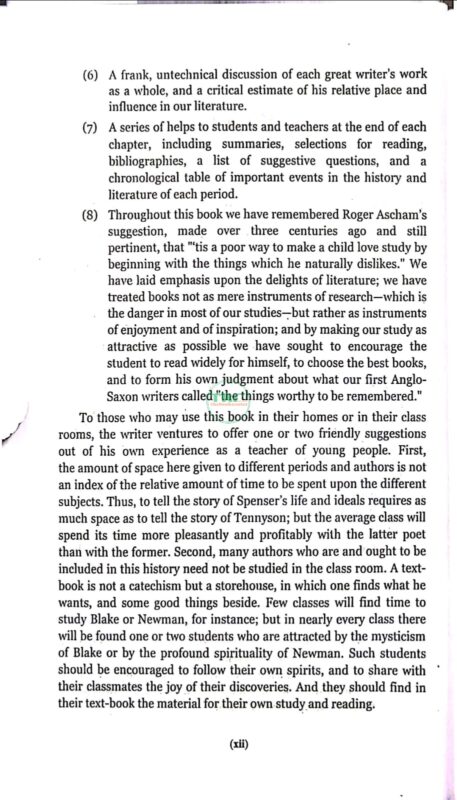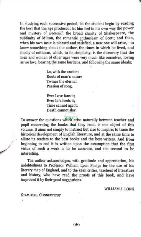 This book, which presents the whole splendid history of English literature from Anglo-Saxon times to the close of the Victorian Era, has three specific aims. The first is to create or to encourage in every student the desire to read the best books, and to know literature itself rather than what has been written about literature. The second is to interpret literature both personally and historically, that is, to show how a great book generally reflects not only the author’s life and thought but also the spirit of the age and the ideals of the nation’s history. The third aim is to show, by a study of each successive period, how our literature has steadily developed from its first simple songs and stories to its present complexity in prose and poetry.