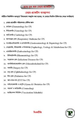 হ্যান্ড বুক অফ চেম্বার প্র্যাকটিস সিপি (বাংলা) একটি বাস্তবভিত্তিক ও ক্লিনিক্যালি গুরুত্বপূর্ণ গাইড, যা চিকিৎসকদের চেম্বারভিত্তিক প্র্যাকটিসকে সহজ, কার্যকর ও সুনির্দিষ্ট করতে সহায়তা করে। সাধারণ ও জটিল রোগের চিকিৎসা, ওষুধের ডোজ, ডায়াগনোসিস স্টেপস, ফলো-আপ গাইডলাইন এবং প্রেসক্রিপশন লেখার আদর্শ কাঠামোসহ রোগীর ব্যবস্থাপনার যাবতীয় বিষয় এতে অন্তর্ভুক্ত। “হ্যান্ড বুক অফ চেম্বার প্র্যাকটিস সিপি (বাংলা)” বইটি প্র্যাকটিসরত চিকিৎসক, নতুন এমবিবিএস গ্র্যাজুয়েট ও মেডিকেল ছাত্রদের জন্য একটি প্রয়োজনীয় হাতিয়ার।