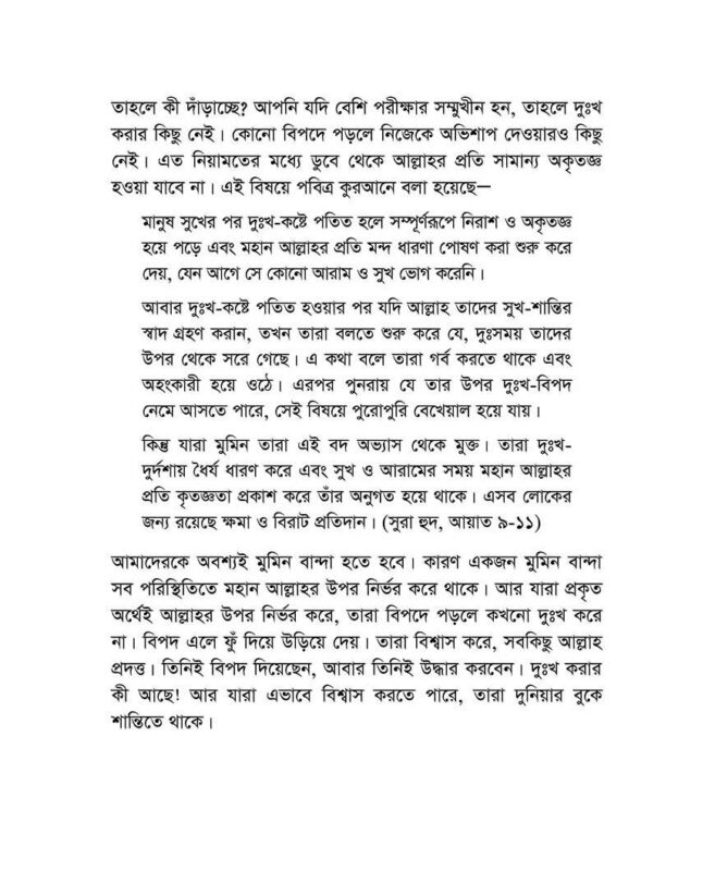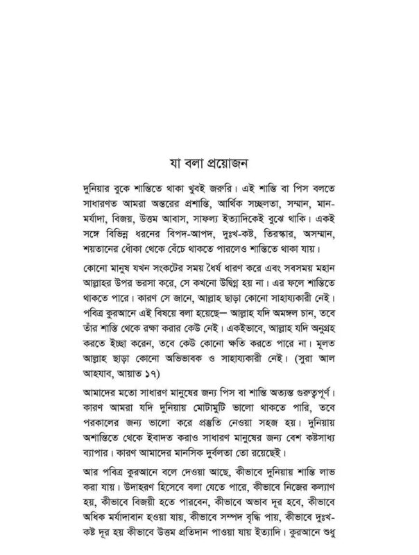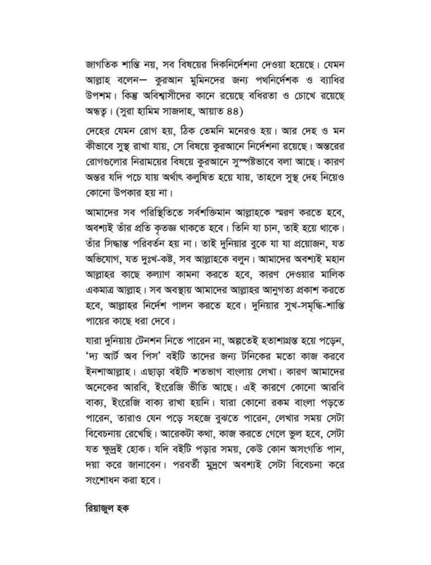 “হতাশাগ্রস্ত জীবনের মেডিসিন” দিনশেষে সবাই আমরা পিস বা শান্তি খুঁজে ফিরি। দুনিয়ার বুকে কীভাবে শান্তিতে থাকা যায়, সেই বিষয়গুলো গ্রন্থটিতে আলোচনা করা হয়েছে। এই শান্তি বলতে অন্তরের প্রশান্তি, আর্থিক সচ্ছলতা, সম্মান, মান-মর্যাদা, বিজয়, উত্তম আবাস, সাফল্য ইত্যাদিকেই বোঝানো হয়েছে। একই সঙ্গে বিভিন্ন ধরনের বিপদ-আপদ, দুঃখ-কষ্ট, তিরস্কার, অসম্মান, শয়তানের ধোঁকা থেকে বেঁচে থাকতে পারলেও শান্তিতে থাকা যায়। আমাদের মতো সাধারণ মানুষ যদি দুনিয়ায় শান্তিতে থাকতে পারি, তবে আখিরাতের জন্য ভালো প্রস্তুতি নেওয়া সহজ হয়। এজন্য শান্তিতে থাকা আমাদের জন্য অত্যন্ত গুরুত্বপূর্ণ। এই গ্রন্থটিতে শান্তিসংশ্লিষ্ট বিষয়গুলো সহজভাবে আলোচনা করা হয়েছে। কীভাবে দুনিয়ায় শান্তিতে থাকা যায়, এটাই এই গ্রন্থের মূল কথা। ‘দ্য আর্ট অব পিস’ গ্রন্থটি মূলত পবিত্র আল-কুরআনের আলোকে লেখা হয়েছে, যা শান্তির অন্বেষণে থাকা মানুষের শান্তির পথ খুঁজে পেতে সহায়ক হবে বলে দৃঢ় বিশ্বাস। যারা দুনিয়ায় টেনশন নিতে পারেন না, অল্পতেই হতাশাগ্রস্ত হয়ে পড়েন, মন খারাপ থাকে, অস্থির অনুভব করেন, এই বইটি তাদের জন্য মহৌষধের মতো কাজ করবে।