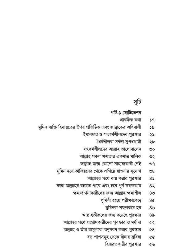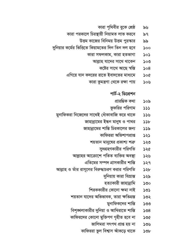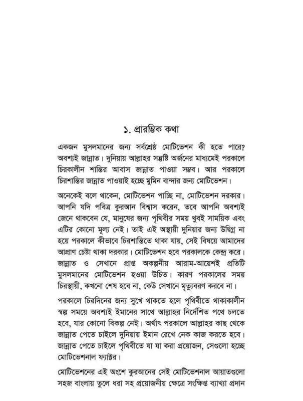 মোটিভেশন ডিপ্রেশন সম্পর্কে আমাদের যে প্রচলিত ধারণা রয়েছে, এই বই সেই ধারণা পাল্টে দেবে। কারণ আমাদের অধিকাংশ মানুষের সকল চাওয়া পৃথিবীকেন্দ্রিক। আর সেই চাওয়া পূরণের জন্যই আমরা নিজেদেরকে মোটিভেটেড করি, না পেলে ডিপ্রেশনে ভুগে থাকি। অথচ পৃথিবীর অর্জন-ব্যর্থতা সব কিছুই সাময়িক সময়ের জন্য।মহা পবিত্র গ্রন্থ আল-কুরআন আমাদের মহাসাফল্য লাভের সন্ধান দিয়ে থাকে। কিন্তু এই মহাসাফল্য বলতে দুনিয়ায় অসীম ক্ষমতা লাভ কিংবা টাকা পয়সার মালিক হওয়া বুঝায় না। মহাসাফল্য বলতে আল্লাহর সন্তুষ্টি অর্জনের মাধ্যমে জান্নাত প্রাপ্তিকেই বোঝায়। এই বইটিতে পৃথিবীর জীবনে কী কী করলে ও কীভাবে চললে, মহান আল্লাহ জান্নাত দান করবেন সেই সকল বিষয় এবং মহান আল্লাহর অসীম ক্ষমতা ও অপরিসীম নিয়ামতের বিবরণ সহজভাবে মোটিভেশন পার্টে তুলে ধরা হয়েছে। একইভাবে, দুনিয়ায় পাপাচারের কারণে পরকালে মানুষ চিরস্থায়ীভাবে কঠিন আজাবের স্থান জাহান্নামে থাকবে এবং কিয়ামতের দিন ভয়াবহ পরিস্থিতির সম্মুখীন হবে, যা ডিপ্রেশন পার্টে সহজ বাংলায় তুলে ধরা হয়েছে। মোটিভেশন এবং ডিপ্রেশন উভয় পার্টে প্রয়োজনীয় ক্ষেত্রে কুরআনের আয়াতসমূহের সংক্ষিপ্ত ব্যাখ্যা প্রদান করা হয়েছে, যা পাঠকদের বুঝতে সাহায্য করবে।