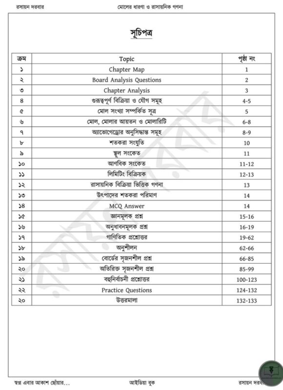 ‘আইডিয়া বুক মোলের ধারনা ও রাসায়নিক গণনা’ নবম ও দশম শ্রেণির শিক্ষার্থীদের জন্য তৈরি একটি পূর্ণাঙ্গ রসায়ন সহায়িকা। বইটি রসায়ন বিষয়ের অন্যতম গুরুত্বপূর্ণ অধ্যায় “মোলের ধারণা ও রাসায়নিক গণনা” সহজভাবে ব্যাখ্যা করেছে। এতে মোলের তত্ত্ব, মোলার ভলিউম, স্টোইকিওমেট্রি, রাসায়নিক সমীকরণ, এবং গাণিতিক বিশ্লেষণ ধাপে ধাপে উপস্থাপন করা হয়েছে। শিক্ষার্থীরা যেন মৌলিক ধারণাগুলো সহজে বুঝতে ও প্রয়োগ করতে পারে, সেই লক্ষ্যেই প্রতিটি সূত্র, উদাহরণ ও অনুশীলন প্রশ্ন যুক্ত করা হয়েছে।