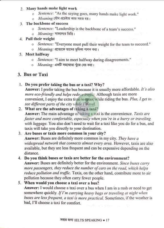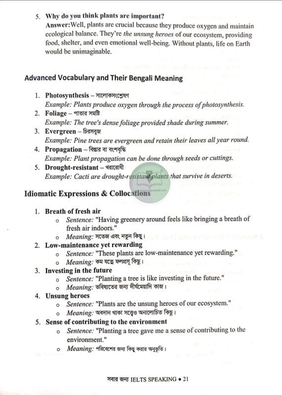 “সবার জন্য IELTS SPEAKING (3 in 1)” বইটি নামেই প্রতিফলিত, কারণ এটি সবার জন্য উপযোগী করার চেষ্টা করেছি । বইটিতে কার্যকরী কৌশল, গুরুত্বপূর্ণ Vocabulary, এবং সঠিক Answer Structure দেওয়া হয়েছে, যা আপনাকে আত্মবিশ্বাসী ও প্রস্তুত করবে। নতুন কিংবা অভিজ্ঞ যে কেউ এই বই থেকে উপকৃত হতে পারবেন। এটি এমন একটি গাইড যা আপনাকে IELTS Speaking-এ High Score অর্জনে নিশ্চিতভাবে সহায়তা করবে। এটি এমনভাবে সাজানো হয়েছে, যাতে আপনি উন্নত উত্তর সংগঠনের দক্ষতা (Answer Organization Skills), শব্দভাণ্ডারের বৈচিত্র্য (Vocabulary and Idiomatic with বাংলা Meaning), এবং সঠিক গ্রামার ও Tense-এর ব্যবহার (Grammar Usage) রপ্ত করতে পারেন। বইটিতে ১৫০+ Part 1 টপিকের Sample Answer, ৬৫টি Part 2 টপিকের জন্য Idea Generation Mind Map, এবং Part 1, 2 ও 3-এর জন্য Band 9 Answer Structure দেওয়া হয়েছে, যা আপনাকে দ্রুত ও সুগঠিত উত্তর গঠনে সাহায্য করবে। ৩২৫টি Part 3 প্রশ্নের উত্তর বিশদভাবে ব্যাখ্যা করা হয়েছে, যাতে আপনি কঠিন প্রশ্নেরও আত্মবিশ্বাসের সঙ্গে উত্তর দিতে পারেন। এছাড়া, প্রয়োগ করা Tense-এর বিস্তারিত ব্যাখ্যা, Topic-Specific Vocabulary ও Idiomatic Expressions বাংলা অর্থসহ, এবং Collocations-এর কার্যকরী ব্যবহার দেওয়া হয়েছে, যা আপনার ভাষাকে আরও Fluent, Natural ও Organized করে তুলবে।