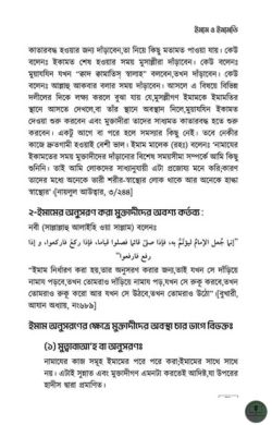 ইমাম ও মুআয্ যিনের করণীয় ও বর্জনীয় বিষয়গুলো স্পষ্টভাবে বর্ণিত। প্রতিটি মাসআলার হাদীস ও ফিকহভিত্তিক ব্যাখ্যা দেওয়া হয়েছে। সৌদি স্থায়ী ফতোয়া বোর্ডের মতামতও অন্তর্ভুক্ত করা হয়েছে। সহজবোধ্য ও সাবলীল ভাষায় রচিত, যা ছাত্র, ইমাম, মুআয্ যিন ও সাধারণ মুসল্লী— সকলের জন্য উপকারী। এই বইটি হাতে থাকলে একজন ইমাম তার ইমামতি সম্পর্কিত প্রায় সকল প্রশ্নের উত্তর পেয়ে যাবেন ইনশাআল্লাহ। ইসলামের এই মহান দায়িত্ব পালনে এটি হবে একটি বিশ্বস্ত সহায়ক গ্রন্থ।কেন পড়বেন এই বইটি? ইমামতি ও আযানের শুদ্ধ বিধান জানতে নামায সংক্রান্ত জটিল মাসআলা সহজভাবে বুঝতে ইসলামী ফিকহে গভীর জ্ঞান অর্জনের সহায়ক হিসেবে ইমাম ও মুআয্ যিনদের জন্য নির্ভরযোগ্য রেফারেন্স বই হিসেবে ইমাম, মুআয্ যিন ও মুসলমানদের জন্য এটি এক অপরিহার্য গ্রন্থ।