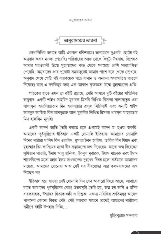 কিন্তু বড় আফসোসের বিষয় হল, উম্মতের মায়েরা আজ সেসব বীর সেনানী ও শ্রেষ্ঠ আলেমদের প্রস্তুত করতে পারছে না। উম্মাহর প্রয়োজন আজ সেসব মায়েদের; যারা নিজেদের সন্তানকে ওয়াকফ করে দেবে লিওয়াজহিল্লাহ। সেই সব মায়েদের জাগিয়ে দিতে, তাদের কর্ণকুহরে রাসুলের মূল্যবান বাণীগুলোকে গেঁথে দিতে আমার এ ছোট্র প্রয়াস।