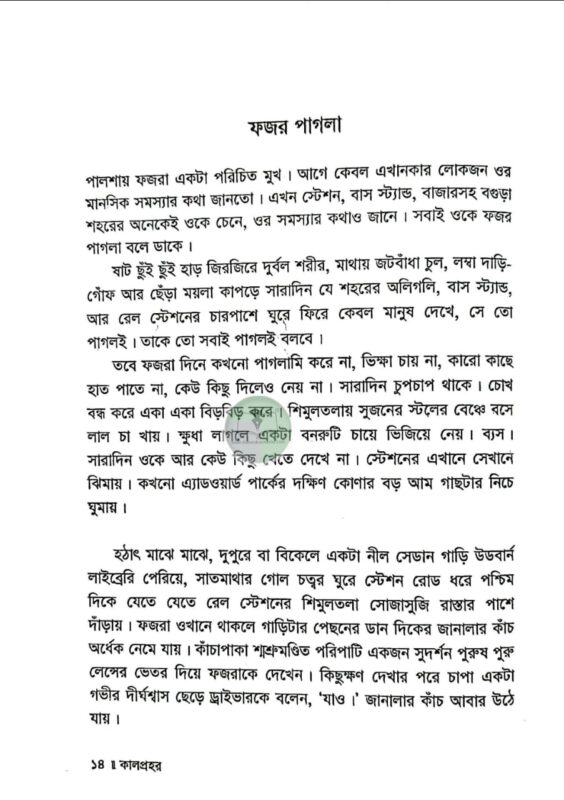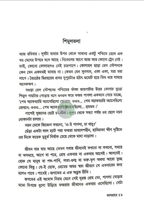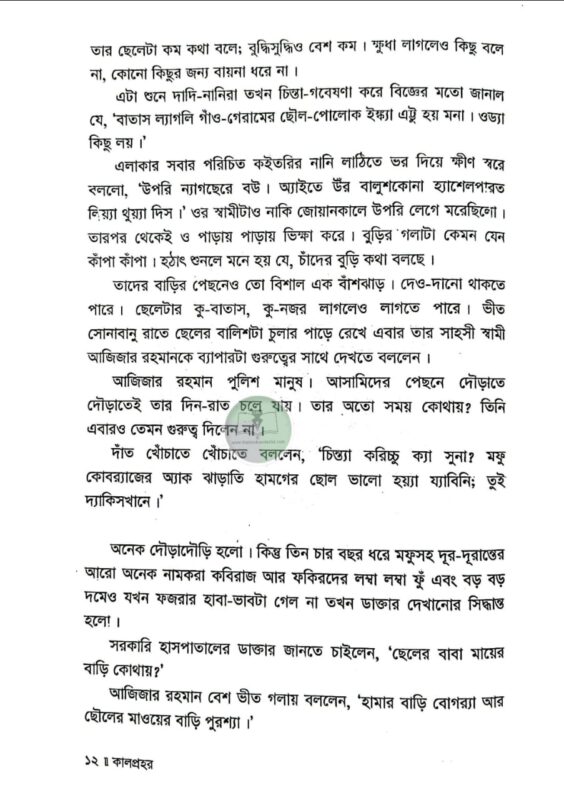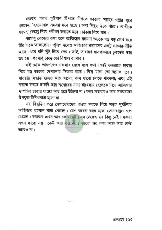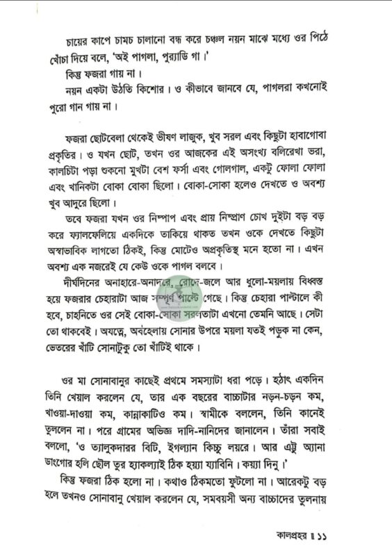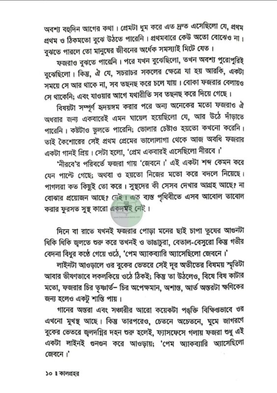 দাদি নানিরা নাকি আগে অমাবশ্যার এমন রাতকে কালনিশি বলতেন। এই রাতের কোনো এক অংশে কালপ্রহর নামে ভয়ংকর একটা প্রহর আছে। অন্ধকার দিগন্তের আড়ালে সূর্য চাঁদটাকে খেয়ে ফেলে। পৃথিবী তখন কাঁপতে থাকে। নদীর পানি কাছাড় ভেঙে ডাঙ্গায় উঠে আসে। অনেক জায়গায় ভূমিকম্প হয়। কালপেঁচারাও নাকি তখন খুব ডাকাডাকি করে। সেই সময়টা নাকি খুবই অশুভ। অমঙ্গলের আশংকায় তাঁরা এই রাতে বাড়ির কাউকে বাইরে যেতে দিতেন না…’ এক ভয়ানক কালবেলার গল্প ‘কালপ্রহর।’ বগুড়ার প্রেক্ষাপটে রচিত এই উপন্যাসের মূল উপজীব্য সামাজিক অবক্ষয়। কিশোর গ্যাং কালচার এখন আমাদের সমাজের এক ভয়াবহ ক্যান্সার। এই কিশোর গ্যাং, মাদক, অপহরণ, খুন ইত্যাদি সামাজিক অপরাধের মরণচক্রে পিষ্ট হয়ে বুদ্ধি প্রতিবন্ধী এক কিশোরের জীবনের নানা প্রতিকূলতা, তার ব্যর্থ প্রেম এবং অবশেষে করুণ পরিণতি বরণ করার ঘটনাসমূহ নিয়ে বেড়ে উঠেছে কাহিনি। উপন্যাসের সংলাপ সমৃদ্ধ হয়েছে বগুড়ার আঞ্চলিক ভাষায়। হাবা ফয়জারের সরল শৈশব এবং বেদনার্ত কৈশোর যে কাউকে বেদনায় মুহ্যমান করবে; বেশি ভারাক্রান্ত হবেন ওর বর্তমান যন্ত্রণার কথা জেনে। আনমনে স্টেশন রোড ধরে পালশার দিকে যেতে যেতে থমকে দাঁড়িয়ে আপনিও হয়তো বগুড়া রেল স্টেশনের উত্তর কোণার শিমুলতলায় ফজর পাগলাকে খুঁজবেন। এই ক্ষয়িষ্ণু সমাজের নিদারুণ কশাঘাতে নিষ্পাপ ফয়জার আজ ফজর পাগলা। শীতে-বর্ষায় আজও রাতের ট্রেনের অপেক্ষায় থাকে। ফয়জার নাহয় খুব দুখী; কিন্তু ওর এই অবস্থার জন্য দায়ী কে? একই পীড়িত বৃত্তে বাস করে আমরা কি খুব সুখী? পাঠ শেষে এই নির্মম প্রশ্নগুলো যদি আপনাকে বিব্রত করে, তাহলেই ‘কালপ্রহর’ সার্থক।