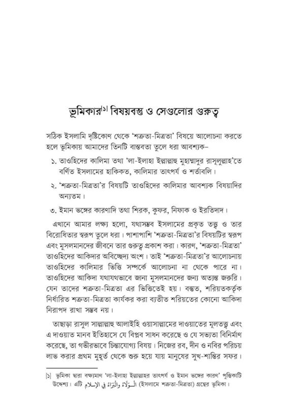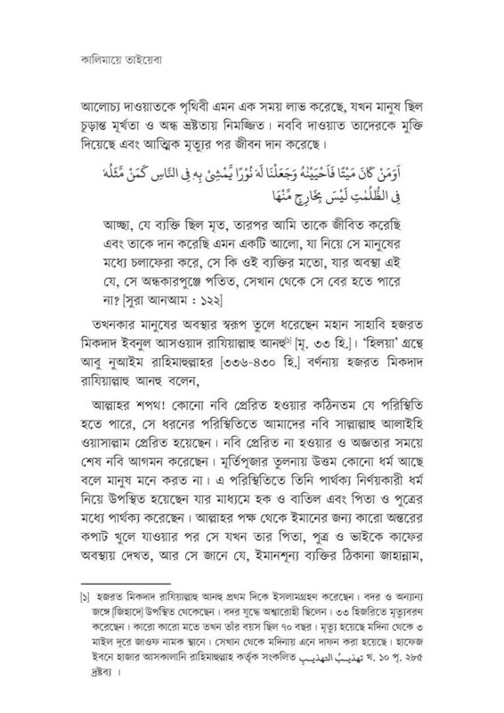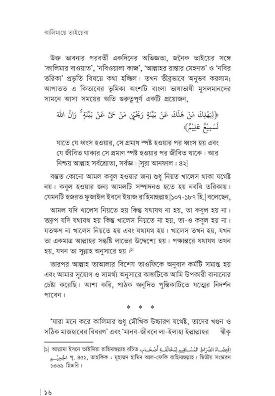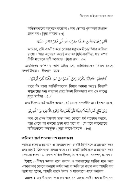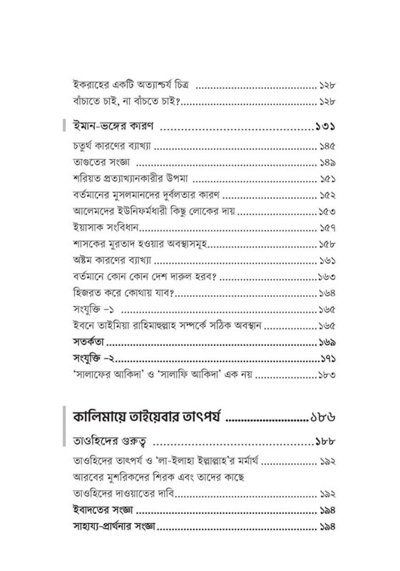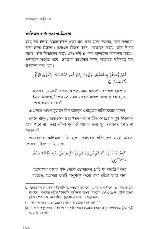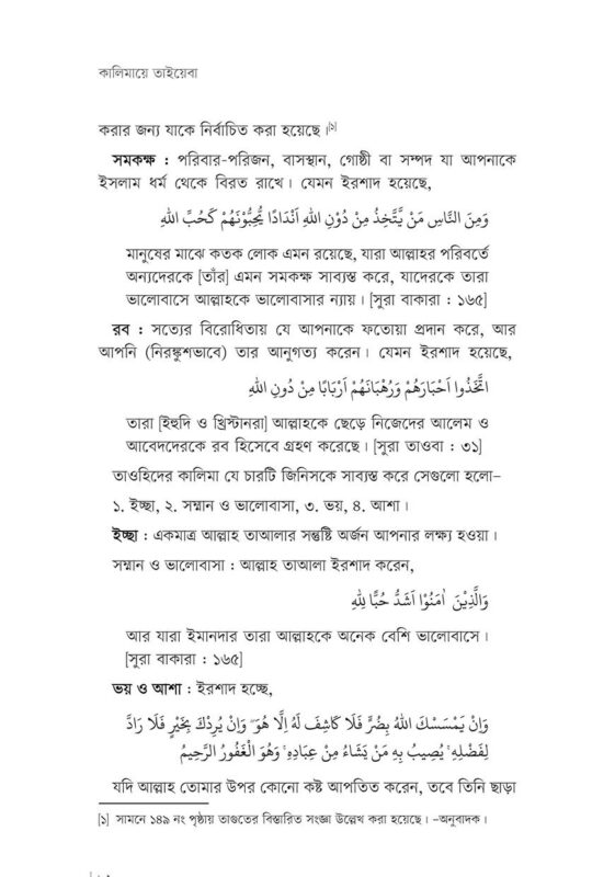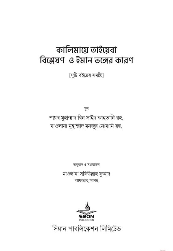 “কালিমায়ে তাইয়েবা বিশ্লেষণ ও ইমান ভঙ্গের কারণ” তাওহিদ মানুষের শুধু এ-স্বীকৃতি প্রদানের নাম নয় যে, আল্লাহ ব্যতীত কোনো স্রষ্টা নেই এবং আল্লাহ প্রতিটি বস্তুর মালিক ও প্রতিপালক। কারণ, এতটুকু স্বীকৃতি আরবের মূর্তিপূজারীদের মধ্যেও ছিল, অথচ তারা ছিল মুশরিক।মূলত তাওহিদের জন্য উক্ত স্বীকৃতির পাশাপাশি এমন কিছু বিষয় থাকাও আবশ্যক, যার অসিলায় গুনাহ থেকে বিরত থাকা যায় এবং একই গুনাহে বারবার পতিত হওয়া থেকে রক্ষা পাওয়া সম্ভব হয়; যেমন, আল্লাহকে ভালোবাসা, তাঁর আনুগত্যে পূর্ণ আত্মসমর্পণ করা এবং সর্বোপরি সকল আচরণ-উচ্চারণের মাধ্যমে একমাত্র তাঁর সন্তুষ্টি কামনা করা।‘লা-ইলাহা ইল্লাল্লাহ’র সাক্ষ্যদান বাস্তবায়নের দাবি হচ্ছে, একমাত্র আল্লাহর জন্যই মানুষকে ভালোবাসা এবং আল্লাহর জন্যই তাদের সাথে বিদ্বেষ পোষণ করা, আল্লাহর জন্যই বন্ধুত্ব করা এবং একমাত্র আল্লাহর জন্যই শত্রুতা করা; সর্বোপরি তাগুতকে প্রত্যাখ্যান করা এবং তাওহিদের বিপরীত সকল প্রকার শিরক থেকে বেঁচে থাকা।মুসলিম উম্মাহর মাঝে আজ দেখা দিয়েছে আত্মপরিচয়ের বিস্মৃতি। মুসলিমরা দিকভ্রান্তের মতো শিরকের অলিগলিতে ছুটে বেড়াচ্ছে। এ অন্ধকার থেকে বের হয়ে জীবনের সঠিক পথ পেতে এবং পরকালীন উন্নতি অর্জন করতে প্রত্যেক মুসলিমের জন্য অবশ্যকর্তব্য হলো—কালিমায়ে তাইয়েবার বিশ্লেষণ ও তাৎপর্য সম্পর্কে জানা। তাদের উদ্দেশ্যেই আমাদের এই প্রয়াস।