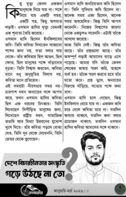 কলমকার জানুয়ারি-মার্চ ২০২৬ সংখ্যাটি মূলত “ইনকিলাবের কবি” ওসমান হাদির স্মৃতি এবং তাঁর অসমাপ্ত লড়াইয়ের এক দর্পণ। আমাদের জাতীয় জীবনের এক ক্রান্তিলগ্নে প্রকাশিত এই সংখ্যায় হাদির বলিষ্ঠ কণ্ঠস্বর ও তাঁর মৃত্যু পরবর্তী শূন্যতাকে তুলে ধরা হয়েছে। ওসমান হাদি কেবল সাজানো শব্দের কবি ছিলেন না, বরং তিনি ছিলেন সত্য ও প্রতিরোধের প্রতীক। বর্তমান সময়ে যখন বিচারহীনতার সংস্কৃতি ও আধিপত্যবাদ আমাদের সমাজকে গ্রাস করছে, তখন হাদির এই বলিদান আমাদের নির্লিপ্ততাকে প্রশ্নের সম্মুখীন করে। ফিলিস্তিনে চলমান গণহত্যা থেকে শুরু করে দেশীয় ষড়যন্ত্র—সব ক্ষেত্রেই আমাদের অবস্থান হোক সত্যের পক্ষে। কবির মৃত্যু হলেও তাঁর চেতনা আজ লক্ষ লক্ষ তরুণের মাঝে “হাদি” হয়ে বেঁচে আছে। এই সংখ্যাটি পাঠকদের সেই ইনকিলাবের ইশতাহার ঘোষণার আহ্বান জানায়, যেখানে অন্যায় ও শোষণের বিরুদ্ধে আপসহীন সংগ্রামের অঙ্গীকার রয়েছে। কলমকার জানুয়ারি–মার্চ ২০২৬ সংখ্যা সেই ইনকিলাবী চেতনারই দর্পণ—যেখানে অন্যায় ও শোষণের বিরুদ্ধে আপসহীন সংগ্রামের অঙ্গীকার উচ্চারিত হয়।