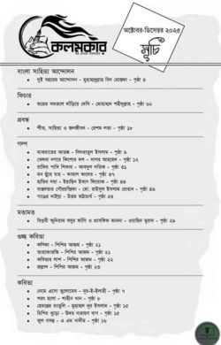 “কলমকার অক্টোবর–ডিসেম্বর ২০২৫” বাংলা সাহিত্য আন্দোলনের মুখপত্র হিসেবে প্রকাশিত একটি ত্রৈমাসিক সাহিত্য পত্রিকা, সূচি প্রবন্ধ ও নিবন্ধ • শিরোনাম: দুই বছরের আন্দোলন o লেখক: মুহাম্মদুল্লাহ বিন মোস্তফা, গোবিন্দগঞ্জ, ছাতক, সুনামগঞ্জ। • শিরোনাম: শীত, সাহিত্য ও জনজীবন o লেখক: রেশম লতা, নেত্রকোনা, ময়মনসিংহ। • শিরোনাম: বিপ্লবী ক্ষুদিরাম বসুর ফাঁসি ও প্রাসঙ্গিক ভাবনা o লেখক: ওয়াহিদ মুরাদ, নিউ ইস্কাটন, ঢাকা। • শিরোনাম: শুভ্রের সমতলে দাঁড়িয়ে দেখি o লেখক: মোহাম্মদ শহীদুল্লাহ, শ্যামগঞ্জ বাজার, ময়মনসিংহ। গল্প • শিরোনাম: মাঝরাতের আতঙ্ক o লেখক: সিদরাতুল ইসলাম, রিকাবি বাজার, সিলেট। • শিরোনাম: খেলনা নগরে কিশোর দল o লেখক: সাগর আহমেদ, খিলগাঁও, ঢাকা। • শিরোনাম: রাফির পাখি শিকার o লেখক: আবদুল লতিফ, মহাখালী, ঢাকা। • শিরোনাম: মন ছুঁয়ে যায় o লেখক: কামাল কাদের, ইলফোর্ড, ইংল্যান্ড। • শিরোনাম: হাতির দয়া o লেখক: ইয়াছিন ইবনে ফিরোজ, শিক্ষার্থী, কুমিল্লা বিশ্ববিদ্যালয়। • শিরোনাম: বাস্তবতার গৌরচন্দ্রিকা o লেখক: মো: রাইসুল ইসলাম রোহান, ময়মনসিংহ। • শিরোনাম: গাঙের নাইয়া o লেখক: উত্তম ভট্টাচার্য, যাদবপুর, কোলকাতা, ভারত। কবিতা • শিরোনাম: নেমে এসো তুলোমেঘ o লেখক: নূর-ই-ইলাহী, তেঁতুলিয়া, পঞ্চগড়। • শিরোনাম: শরৎ হলো o লেখক: শাহীন খান, বানারীপাড়া, বরিশাল। • শিরোনাম: হেমন্তের রংতুলি o লেখক: মুহাম্মদ নূর ইসলাম, বাঘা, রাজশাহী। • শিরোনাম: মিশির খুড়ো o লেখক: উদয় নারায়ণ বাগ, হিড়বাঁধ, বাঁকুড়া, ভারত। • শিরোনাম: ফুল বসন্ত o লেখক: এ এম নাদীম, লালমোহন, ভোলা। • শিরোনাম: অপেক্ষার শরৎ o লেখক: শেখ সুলতানা মীম, শিক্ষার্থী, ইডেন মহিলা কলেজ। • শিরোনাম: ষড় ঋতু o লেখক: হাসনাত মামুন, ফরিদপুর, পাবনা। • শিরোনাম: শীত দিয়েছে ঘুমটা o লেখক: নার্গিস আক্তার, ইসলামপাড়া, গোপালগঞ্জ। • লেখক: শিশির আজম (গুচ্ছ কবিতা) o শিরোনাম: কণিকা o শিরোনাম: তারকোভস্কি o শিরোনাম: কবিতার লাশ o শিরোনাম: জল্লাদ • শিরোনাম: শরৎ বার্তা o লেখক: বি এম মিজানুর রহমান, লোহাগড়া, নড়াইল। • শিরোনাম: শরৎ রানি o লেখক: হাফিজ মুহাম্মদ, ফুলবাড়ী, কুড়িগ্রাম। • শিরোনাম: মেঘের ঘণঘটা o লেখক: এ.এস.এম সোহেল ভূঁইয়া, নেত্রকোনা সদর, নেত্রকোনা। • শিরোনাম: শরতে প্রেম জাগে o লেখক: আসাদ সরকার, পশ্চিম ব্রাহ্মন্দী, নরসিংদী সদর। • শিরোনাম: এতো সেলের ফারাক কেন o লেখক: দিলীপ কুমার পাত্র, ময়না, পূর্ব মেদিনীপুর, ভারত। • শিরোনাম: তবুও আলো o লেখক: কেতকী বসু, দক্ষিণ ২৪ পরগনা, ভারত। • শিরোনাম: কাশফুল o লেখক: মোঃ সৈয়দুল ইসলাম, হাসারচর, শান্তিগঞ্জ, সুনামগঞ্জ। • শিরোনাম: শরতের ছোঁয়া o লেখক: বিধান চন্দ্র দেবনাথ, সাচনা বাজার, জামালগঞ্জ, সুনামগঞ্জ। • শিরোনাম: শরতের রূপ o লেখক: মমিনুল পথিক, রাধাবল্লভ, রংপুর মহানগর, রংপুর। • শির