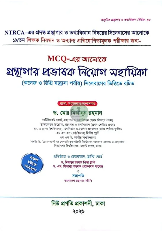 বাংলাদেশের স্কুল, কলেজ ও মাদ্রাসা গ্রন্থাগারের গ্রন্থাগার পেশাজীবীদের ৩১.০৫.২০২১ তারিখে এনটিআরসি-এর মাধ্যমে নিয়োগ আদেশ জারি করে ১৭ ও ১৮তম নিবন্ধন পরীক্ষার মাত্র ২টি ব্যাচের মেধাতালিকার ভিত্তিতে ‘সহকারী শিক্ষা (গ্রন্থাগার ও তথ্যবিজ্ঞান)’ ও ‘গ্রন্থাগার প্রভাষক’-এ চূড়ান্ত করে নিয়োগ প্রদান করা হয়েছে। পুস্তকটি বিগত ২টি ব্যাচের শতভাগ সফলতা পাওয়ার সাথে সাথে ‘গ্রন্থাগার প্রভাষক নিয়োগ সহায়িকা’ বইটি বাজারে ব্যাপক চাহিদা বৃদ্ধি পেয়েছে। গ্রন্থাগার ও তথ্যবিজ্ঞান বর্তমানে উচ্চশিক্ষা এবং পেশাজীবনের ক্ষেত্রে একটি গুরুত্বপূর্ণ ও অগ্রগণ্য বিদ্যা হিসেবে প্রতিষ্ঠিত। বিশেষ করে এনটিআরসিএ-র কলেজ ও মাদ্রাসা ডিগ্রি পর্যায়ের সিলেবাস অনুসারে ১৯তম নিবন্ধনের জন্য অনুযায়ী পরিবর্তিত প্রেক্ষাপটে ‘গ্রন্থাগার প্রভাষক নিয়োগ সহায়িকা (MCQ-এর আলোকে)’ পুস্তকটি রচিত হয়েছে। কেননা সম্পূর্ণ নতুন প্রশ্ন প্যাটার্ন ও নির্দেশনায় নিয়োগ পরীক্ষায় অংশগ্রহণকারীদের জন্য একটি সুসংগঠিত, নির্ভরযোগ্য এবং আলোচনামূলক সহায়ক গ্রন্থের প্রয়োজনীয়তা দারুণভাবে দেখা দিয়েছে। এই প্রয়োজন থেকেই এমসিকিউ এর আলোকে উল্লেখিত শিরোনামের গ্রন্থটি রচনার প্রয়াস।
