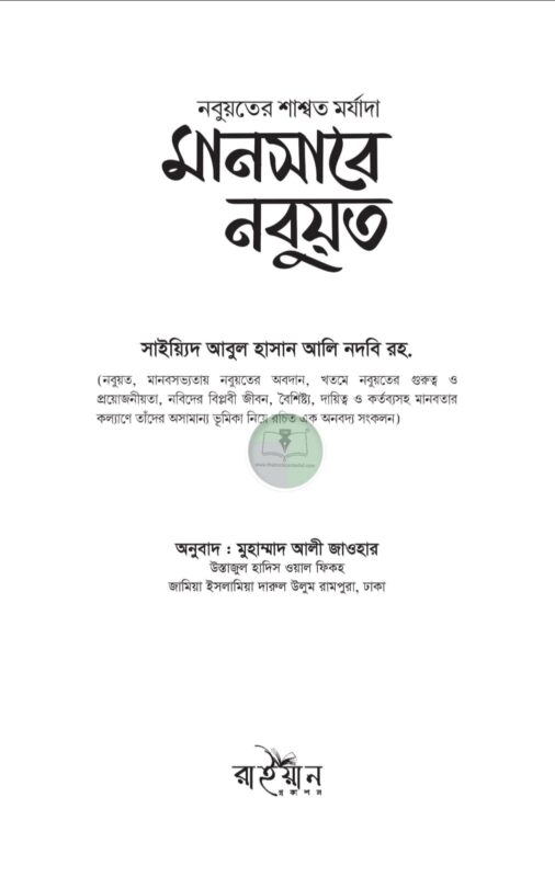 ‘মানসাবে নবুয়ত’ সাইয়্যিদ আবুল হাসান আলি নদবি রহ.-এর এক অনন্য চিন্তাশীল গ্রন্থ। এই গ্রন্থে তিনি নবুয়তের মর্যাদা, প্রয়োজনীয়তা ও বিশ্বমানবতার জন্য রাসুলুল্লাহ সাল্লাল্লাহু আলাইহি ওয়া সাল্লামের আগমনের তাৎপর্য অত্যন্ত প্রাঞ্জল ও হৃদয়গ্রাহী ভাষায় তুলে ধরেছেন। পৃথিবীর ইতিহাসে নবিগণের আগমন কেবল ধর্মীয় ঘটনা নয়; বরং তা মানবতার নৈতিক, আত্মিক ও সামাজিক পুনর্গঠনের এক মহান অধ্যায়-বইটিতে এই সত্যটি গভীরভাবে প্রতিফলিত হয়েছে। বইটিতে লেখক আধুনিক বিশ্বের বুদ্ধিবাদ, সংশয়বাদ ও আত্মিক শূন্যতার প্রেক্ষাপটে নবুয়তের অপরিহার্যতা-যুক্তি, ইতিহাস ও বাস্তব অভিজ্ঞতার আলোকে প্রমাণ করেছেন। এতে দেখানো হয়েছে, নবুয়তই মানব ইতিহাসের সবচেয়ে কার্যকর বিপ্লবের উৎস-যা ব্যক্তি, সমাজ ও রাষ্ট্রকে ন্যায়, করুণা ও ভারসাম্যের পথে পরিচালিত করেছে। ‘মানসাবে নবুয়ত’ মূলত ঈমানের এ মৌল বিশ্বাসকে নতুনভাবে চিনে নেওয়ার এক চিন্তা জাগানিয়া আহ্বান-যেখানে পাঠক নবি কারিম সাল্লাল্লাহু আলাইহি ওয়া সাল্লামকে কেবল ইতিহাসের একজন মহামানব নয়, বরং সমগ্র মানবতার চিরকালীন পথপ্রদর্শক হিসেবে আবিষ্কার করবে। এই গ্রন্থ আত্মসংশোধন, নৈতিক পুনর্জাগরণ ও নববি আদর্শের সঙ্গে জীবনের পুনঃসংযোগের এক অনন্য দিকনির্দেশনা হিসেবে পাঠককে গভীরভাবে আলোড়িত করবে।