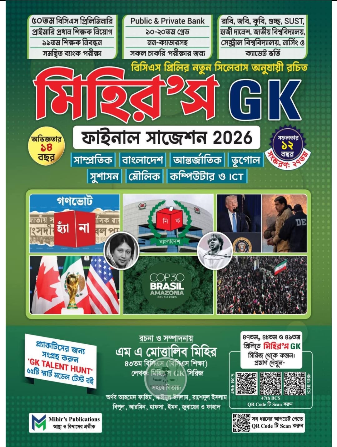 মিহির’স GK ফাইনাল সাজেশন ২০২৬ আসন্ন ৫০তম বিসিএস প্রিলি, প্রাইমারি প্রধান শিক্ষক, ১৯তম নিবন্ধন, ১০-২০তম গ্রেড, public & private ব্যাংক, বিশ্ববিদ্যালয় ভর্তি, নার্সিং ভর্তি পরীক্ষা, গুচ্ছ ও জাতীশ বিশ্ববিদ্যালয় ভর্তি পরীক্ষাসহ সকল প্রতিযোগিতামূলক পরীক্ষায় হুবহু সর্বোচ্চ কমনপ্রাপ্ত সাজেশন। বিশ্ববিদ্যালয় ভর্তি পরীক্ষার সাম্প্রতিক প্রশ্নোত্তর সংযোজন করা হয়েছে। হুবহু কমনের জন্য একবার হলেও লাইব্রেরিতে বইটি দেখার অনুরোধ রইলো। কেননা বিগত ১২ বছর ধরে প্রকাশিত বইটি থেকে জিকে রেকর্ড পরিমাণ কমন, যা অন্য বইয়ে এতো ছোট বইয়ে কখনো কমন ছিল না। ৪৯তম বিসিএস এ ৪০ এ ৩৬টি, ৪৮ বিসিএস এ ৪০ এ ৩৯টি, ৪৭তম বিসিএস এ ৪৭টি, ৪৬তম বিসিএস এ ৬৩টি কমন ছিল মিহির’স GK ফাইনাল সাজেশন থেকে।