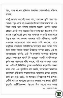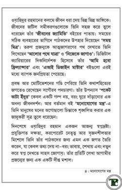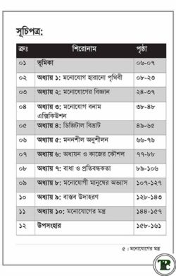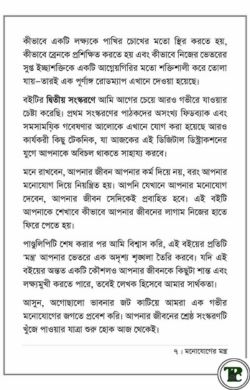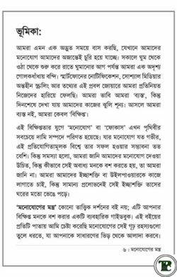 ইচ্ছাশক্তি বৃদ্ধি: নিজের উইলপাওয়ার বা ইচ্ছাশক্তিকে একটি শক্তিশালী পেশির মতো গড়ে তোলার কৌশল আয়ত্ত করবেন। অলসতা মুক্তি: কাজ জমিয়ে রাখার (Procrastination) অভ্যাস ত্যাগ করে কীভাবে তাৎক্ষণিক অ্যাকশন নিতে হয়, তা জানবেন। মানসিক প্রশান্তি: অগোছালো চিন্তা নিয়ন্ত্রণ করে কীভাবে মনের অস্থিরতা কমিয়ে প্রশান্তি আনা যায়, তার দিকনির্দেশনা পাবেন। ২য় সংস্করণের বিশেষত্ব: বইটির এই নতুন সংস্করণে সমসাময়িক চ্যালেঞ্জগুলো মাথায় রেখে আরও নতুন কিছু চ্যাপ্টার এবং এক্সারসাইজ যুক্ত করা হয়েছে। এটি কেবল পড়ার জন্য নয়, এটি চর্চা করার জন্য। কাদের জন্য এই বই? ছাত্রছাত্রী, ফ্রিল্যান্সার, চাকরিজীবী কিংবা উদ্যোক্তা—যারা নিজের ক্যারিয়ারে অনন্য উচ্চতায় পৌঁছাতে চান এবং যারা মনে করেন তাঁদের মনোযোগের অভাবে স্বপ্নগুলো থমকে আছে, তাঁদের প্রত্যেকের জন্য এই বইটি একটি ‘মাস্ট রিড’। আপনার মনোযোগই আপনার ভবিষ্যৎ নির্ধারণ করে। তাই আজই সংগ্রহ করুন ‘মনোযোগের মন্ত্র’ এবং নিজেকে গড়ে তুলুন একজন ফোকাসড মাস্টার হিসেবে।