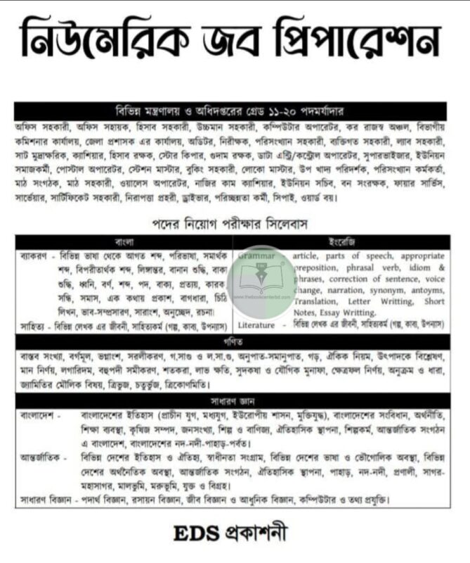 নিউমেরিক জব প্রিপারেশন, বাংলাদেশ সরকারের বিভিন্ন মন্ত্রণালয় ও অধিদপ্তরের গ্রেড ১১ থেকে ২০-এর বিভিন্ন পদের নিয়োগ পরীক্ষার জন্য প্রস্তুত হতে সাহায্য করে, যেখানে বাংলা, ইংরেজি, গণিত এবং সাধারণ জ্ঞান বিষয়ক প্রায় ১৫৭টি পরীক্ষার প্রশ্নব্যাংকের ব্যাখ্যা ও বিষয়ভিত্তিক আলোচনা করা হয়েছে। সরকারি চাকরি, বিশেষত মন্ত্রণালয়, বিভাগ, অধিদপ্তর ও পরিদপ্তরের গ্রেড ১১-২০ পদের প্রিলিমিনারি ও লিখিত পরীক্ষার প্রস্তুতি নেওয়া। “নিউমেরিক জব প্রিপারেশন” বইটিতে বাংলা, ইংরেজি, গণিত এবং সাধারণ জ্ঞান—এই চারটি প্রধান বিষয়কে গুরুত্ব দেওয়া হয়েছে।