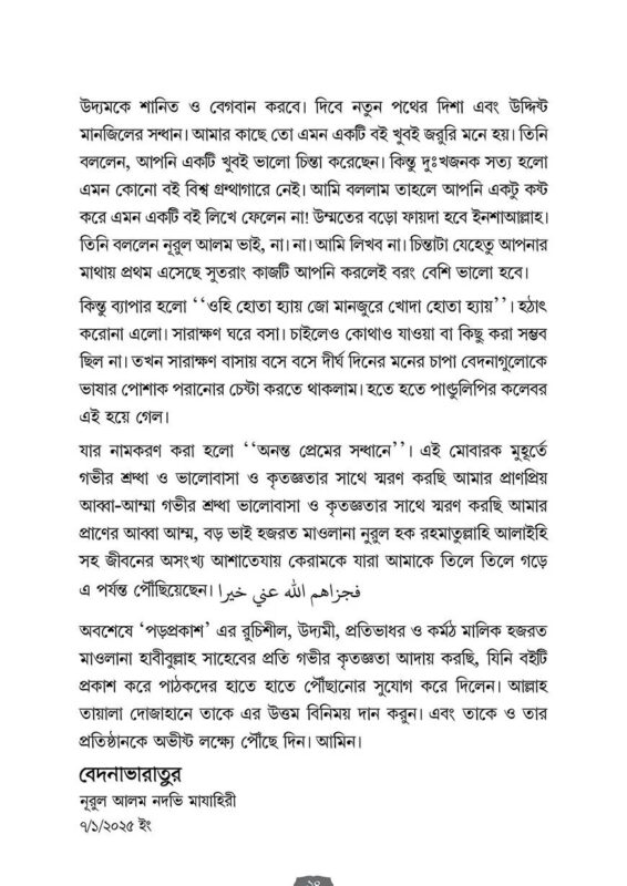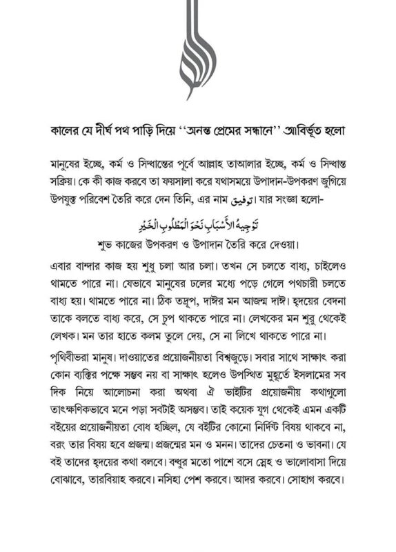 “অনন্ত প্রেমের সন্ধানে” আঁধার রাত। আকাশে কালো ঘনঘটা। সমুদ্র উত্তাল। তার মাঝে একা এক তরুণ নৌযান চালিয়ে যাচ্ছে। যার খাবার শেষ। জ্বালানি ও শেষ প্রায়। সামনে হা করে আছে শত শত হাঙ্গর আর কুমিরের ঝাঁক।অদূরে শোনা যাচ্ছে আসন্ন দস্যুদের জাহাজের শব্দ। তীরে বাঘ-সিংহের তর্জন গর্জন। ওই অসংখ্য শত্রুর মুখে ভয়ার্ত যুবকের সামনে শুধুই মৃত্যুর কালো ছায়া। বাঁচার উপায় কী?প্রয়োজন এক মুঠো খাবার, সামান্য আলো, ভারী অস্ত্র ও উদ্ধারকারী জাহাজের। যাতে সে যে প্রাণে বেঁচে নিরাপদে নিজ ঠিকানায় পৌঁছতে পারে।আজকের নব শিক্ষিত তরুণও অনুরূপ শিক্ষার নামে নানামুখী গোমরাহির সাগরে ভাসমান। ফিতনার তরঙ্গ উত্তাল। জিকরুল্লাহ এর অভাবে আত্মা ক্ষুধার্ত। চতুর্দিকে ইহুদিবাদ, খ্রিস্টবাদ, নাস্তিক্যবাদ ও পৌত্তলিকতার হানাদার দোসরেরা ওঁত পেতে আছে। কীভাবে তরুণকে দিগ্ভ্রান্ত ও দলছুটা করে জাহান্নামের সহযাত্রী বানানো যায়।পাঠক মাত্রই বইটি পড়ে উপকৃত হবে। তবে বিশেষ করে ওই তরুণ এতে পাবে একিনের আলো, আত্মার খোরাক। দলিলের অস্ত্র এবং আকাবিরে উলামাদের জান্নাতগামী জাহাজ। ব্যস, উঠে পড়ল আর নিরাপদে পৌঁছে গেল কাঙ্ক্ষিত মানযিলে। মাওলা পাকের ঘাটে। আর একটু আগালেই দিদারে ইলাহির মাহফিল।