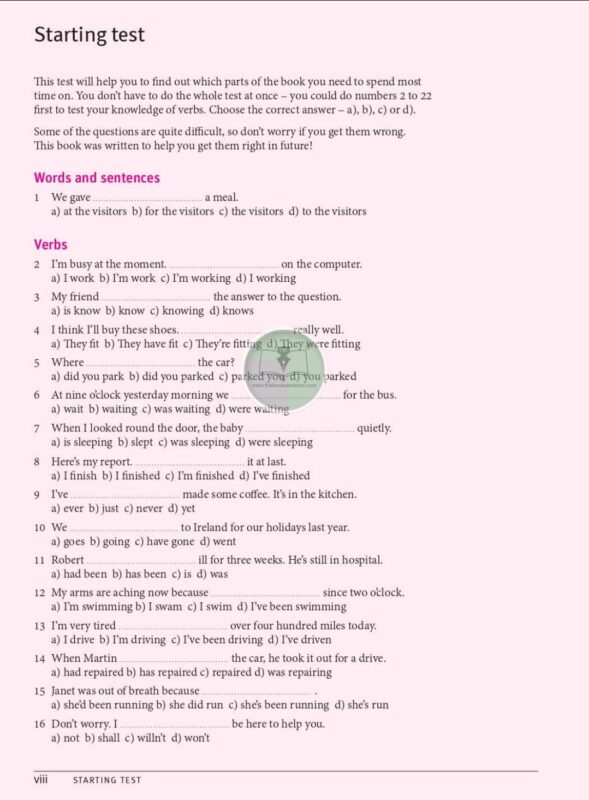 This test will help you to find out which parts of the book you need to spend most time on. You don’t have to do the whole test at once you could do numbers 2 to 22 first to test your knowledge of verbs. Choose the correct answer – a), b), c) or d). Some of the questions are quite difficult, so don’t worry if you get them wrong. This book was written to help you get them right in future!