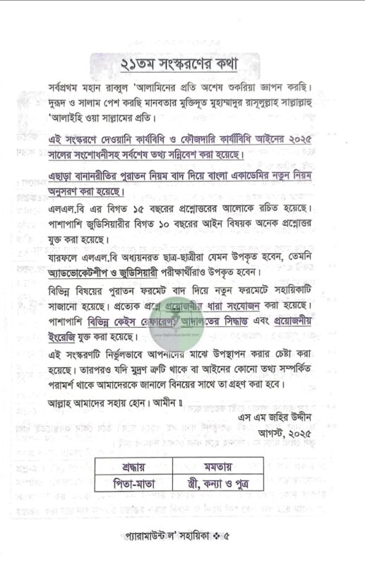 প্যারামাউন্ট এলএল.বি শেষ বর্ষ নতুন সংস্করণ আইন শিক্ষার্থীদের জন্য একটি অনন্য সহায়ক গ্রন্থ। এই সংস্করণে দেওয়ানি কার্যবিধি ও ফৌজদারি কার্যবিধি আইনের ২০২৫ ২ সালের সংশোধনীসহ সর্বশেষ তথ্য সন্নিবেশ করা হয়েছে। এছাড়া বানানরীতির পুরাতন নিয়ম বাদ দিয়ে বাংলা একাডেমির নতুন নিয়ম অনুসরণ করা হয়েছে।এলএল.বি এর বিগত ১৫ বছরের প্রশ্নোত্তরের আলোকে রচিত হয়েছে। পাশাপাশি জুডিসিয়ারীর বিগত ১০ বছরের আইন বিষয়ক অনেক প্রশ্নোত্তর যুক্ত করা হয়েছে। যারফলে এলএল.বি অধ্যয়নরত ছাত্র-ছাত্রীরা যেমন উপকৃত হবেন, তেমনি অ্যাডভোকেটশীপ ও জুডিসিয়ারী পরীক্ষার্থীরাও উপকৃত হবেন। বিভিন্ন বিষয়ের পুরাতন ফরমেট বাদ দিয়ে নতুন ফরমেটে সহায়িকাটি সাজানো হয়েছে। প্রত্যেক প্রশ্নে প্রয়োজনীয় ধারা সংযোজন করা হয়েছে। পাশাপাশি বিভিন্ন কেইস রেফারেন্স, আদালতের সিদ্ধান্ত এবং প্রয়োজনীয় ইংরেজি যুক্ত করা হয়েছে “প্যারামাউন্ট এলএল.বি শেষ বর্ষ” বইটিতে।