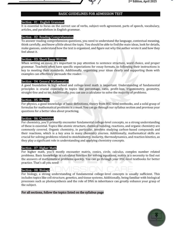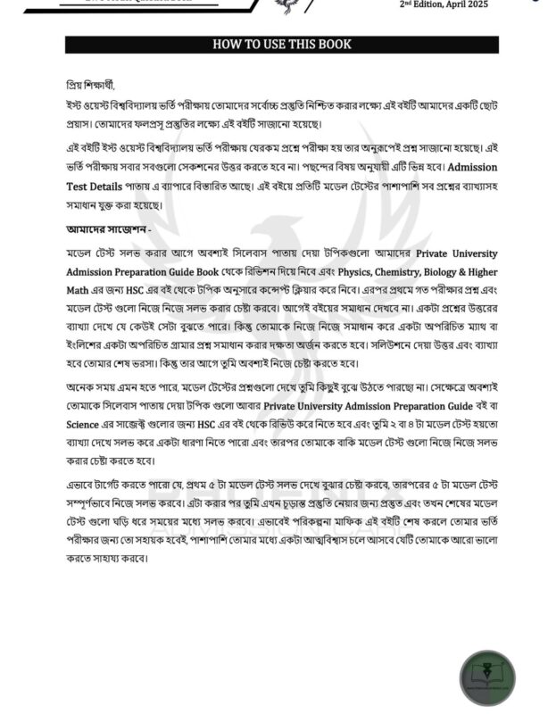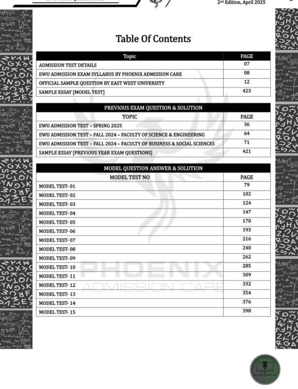 East West University Admission Test এর সর্বোচ্চ Preparation এর জন্য চলে এসেছে EWU Admission Test এর জন্য সহায়ক এই নতুন বই। Admission Test এ পছন্দের Subject এবং Scholarship পেতে তোমার প্রস্তুতির জন্য সর্বোচ্চ সহায়ক হবে এই Phoenix East West University Model Question Book. কী আছে এই East West University Model Question Book এ? এই বইটিতে আছে ইস্ট ওয়েস্ট ইউনিভার্সিটির ভর্তি পরীক্ষার বিষয়ভিত্তিক প্রশ্নের প্যাটার্ন এবং Exclusive এডমিশন টেস্ট সিলেবাস (সর্বশেষ ভর্তি পরীক্ষার প্রশ্নের অনুরূপে)। সাথে আরও আছে 15 টি Model Test, East West University Admission Test এর Standard রেখে, যা Practice করার মাধ্যমে তোমার Preparation কে এগিয়ে নিতে পারবে বহুগুণ। এই বইতে Model Test গুলো East West University ভর্তি পরীক্ষার অনুরূপ Section Wise সাজানো, যার মাধ্যমে English Grammar, Reading Comprehension, General Math, Physics, Higher Math, Chemistry, Biology, Essay প্রশ্নের প্যাটার্ন বুঝে প্র্যাকটিসের সুযোগ রয়েছে। বইটিতে প্রতিটি মডেল টেস্ট এর সাথে যুক্ত করা হয়েছে সেগুলোর Solution যেখানে আছে প্রতিটি প্রশ্নের যথাযথ ব্যাখ্যা ও সমাধান, যেন যেকোনো শিক্ষার্থী Practice এর সময় কোনো প্রশ্ন বুঝতে বা সমাধান করতে সমস্যা হলে যেন এই বই থেকে সঠিক সমাধান দেখে নিতে পারে। তারপরও যদি কোনো শিক্ষার্থী আরো বেশি সাপোর্ট ও Admission Help এর প্রয়োজন বোধ করে, তাহলে তারা যুক্ত হতে পারবে আমাদের ইস্ট ওয়েস্ট ইউনিভার্সিটি এডমিশন কোর্সে। এই বইটিতে আছে EWU Admission Test এর সিলেবাস, সর্বশেষ EWU Admission Test Questions and Answers, EWU Admission Test Sample Question and Answer, এবং ইস্ট ওয়েস্ট ইউনিভার্সিটির ভর্তি পরীক্ষায় আসার উপযুক্ত অনুরূপ ৮ টি Essay। এই English Essay এর যথার্থ Structure Maintain করে দেওয়া sample অনুযায়ী প্র্যাক্টিসের মাধ্যমে এটি ইস্ট ওয়েস্ট ইউনিভার্সিটির ভর্তি পরীক্ষার অন্যতম গুরুত্বপূর্ণ Essay Section এ ভালো ফল পেতে সাহায্য করবে, এবং এই ইংলিশ সেকশনে ভালো করলে একজন শিক্ষার্থীকে “Remedial English’ যা একটি নন-ক্রেডিট কোর্স, তা করতে হবে না। বইটির গুছানো কারিকুলাম এবং Practice Model Test গুলো একজন EWU এবং প্রাইভেট বিশ্ববিদ্যালয় ভর্তি পরীক্ষার্থীর প্রিপারেশনকে এগিয়ে নিবে কয়েকগুণ।