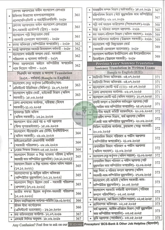 বিসিএস ও ব্যাংক লিখিত পরীক্ষায় অনুবাদ অংশের প্রস্তুতিকে আরও শাণিত করতে প্রিসেপটর্স টিমের অনবদ্য নিবেদন প্রিসেপটর্স টেনশেলেশন Manual অনুবাদের জন্য প্রয়োজনীয় Techniques এবং Grammatical Rules, BCS ও AD’র প্রশ্ন ধাপে ধাপে সমাধানপূর্বক পরীক্ষার হলের প্রতিকূলতা কাটিয়ে ওঠার প্রয়োগ উপযোগী কৌশল। ১৮টি বিষয়ের উপর ২৫০০ এর অধিক words & phrases বাক্যে অনুবাদসহ প্রয়োগ এবং নিজেকে যাচাই করার জন্য প্রতিটি বিষয়ের শেষে অনুশীলন। বিসিএস এবং বাংলাদেশ ব্যাংকের সহকারী পরিচালক পরীক্ষার প্রশ্নসমূহের মানসম্মত অনুবাদ এবং কঠিন বাক্যসমূহের ব্যাখ্যা।