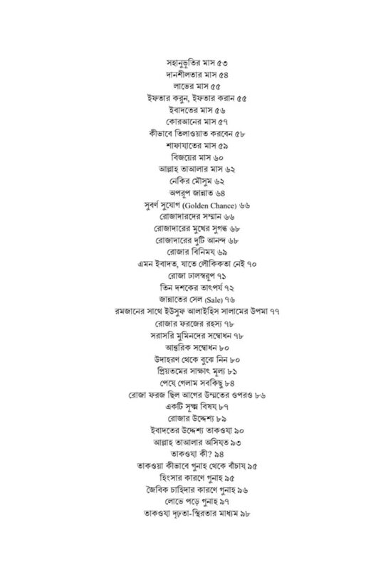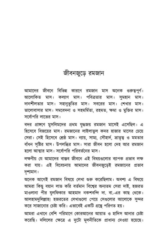 লক্ষণীয় যে, আমাদের বাস্তবজীবনে এই বিষয়গুলোর ব্যাপক প্রভাব লক্ষ করা যায়। এই বিবেচনায় আমাদের জীবন জুড়েই রমাজানের প্রভাব দৃশ্যমান। বইটিতে আমরা কীভাবে সারাবছর রমাজানের নুর দ্বারা উপকৃত হতে পারব, এবিষয়ে সাবলীল আলোচনা করা হয়েছে।