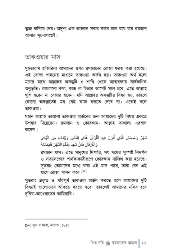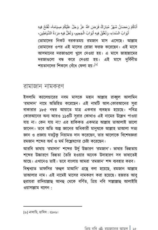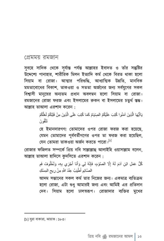 “প্রিয় নবির রমজানের আমল” জীবন জুড়ে রমাযান মানবজীবনে বিভিন্ন কারণে রমাজান মাস অনেক গুরুত্বপূর্ণ। আলোকিত মাস। পবিত্র মাস। সুমহান মাস। কল্যাণের মাস। দানশীলতার মাস। সহানুভূতির মাস। সবরের মাস। শেখার মাস। ভালোবাসার মাস। সমবেদনা ও সহমমর্মিতা রহমত, ক্ষমা ও মুক্তির মাস। সর্বোপরি লাভের মাস।