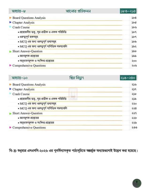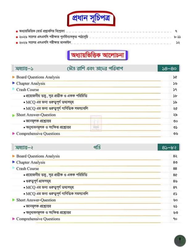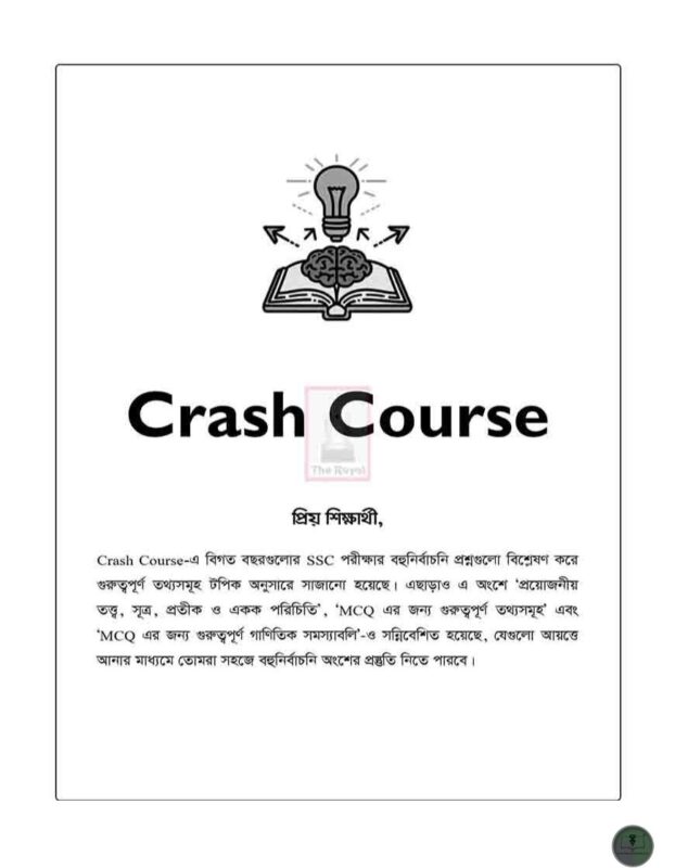 ✒ 𝐂𝐫𝐚𝐬𝐡 𝐂𝐨𝐮𝐫𝐬𝐞: Crash Course এ বিগত বছরগুলোর এসএসসি পরীক্ষার বহুনির্বাচনি প্রশ্নগুলো বিশ্লেষণ করে গুরুত্বপূর্ণ তথ্যসমূহ Topic অনুসারে সাজানো হয়েছে। এছাড়াও এ অংশে প্রয়োজনীয় তত্ত্ব ও সূত্রাবলিও সন্নিবেশিত হয়েছে যেনো তোমরা সহজেই বহুনির্বাচনি অংশের পূর্ণাঙ্গ প্রস্তুতি নিতে পারো ।