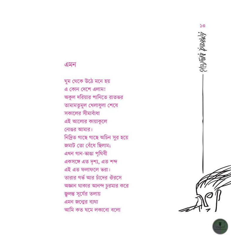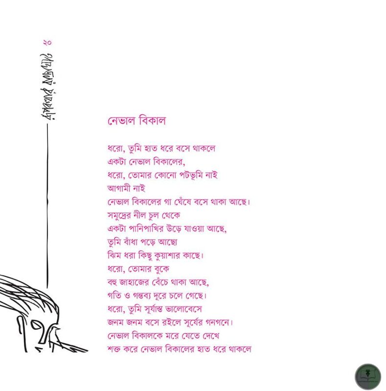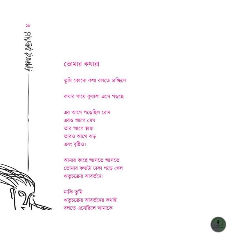এইসব কবিতার মনের বনে রূপকথা চুপচাপ শুয়ে থাকে, ঘিরে ধরে অরণ্যঅন্ধ হাওয়া, গাছ, ফুল, পাখি আর জন্তুর বিভা। কে লিখনকার, কে পঠনকার-অবান্তর তর্ক তা। অনুভবের গায়ে লেগে থাকা অযথা অক্ষর, অক্ষরের গায়ে লেগে থাকা অযথা অনুভবের বিনাশ-সাধনা। কী তাহলে শেষে বা শুরুতে? শুধু বসে থাকা। আয়ুক্ষয় হতে যেতে দিয়ে কবিতার বন রুয়ে দেয়া। দুঃসহ জীবন মেনে না নিতে পেরে মৃত্যুকে মনে নিয়ে দিল্ল খুশ রাখা। মৃত্যু থেকে অমৃতের দিকে তোমাকেই তো দেখা যাচ্ছে রূপকথার রাস্তাঘাট উড়ে চলা ধূলি বালি কিংবা কবিতা..