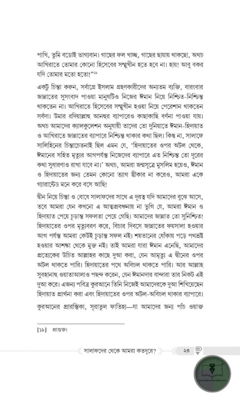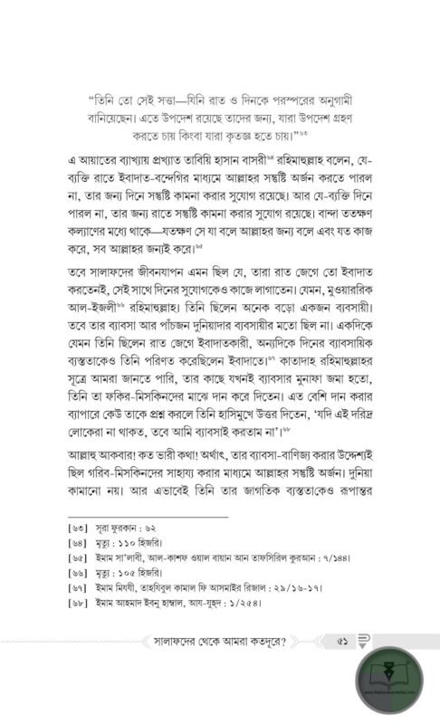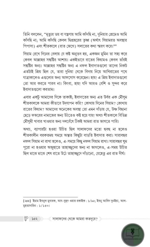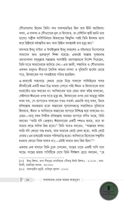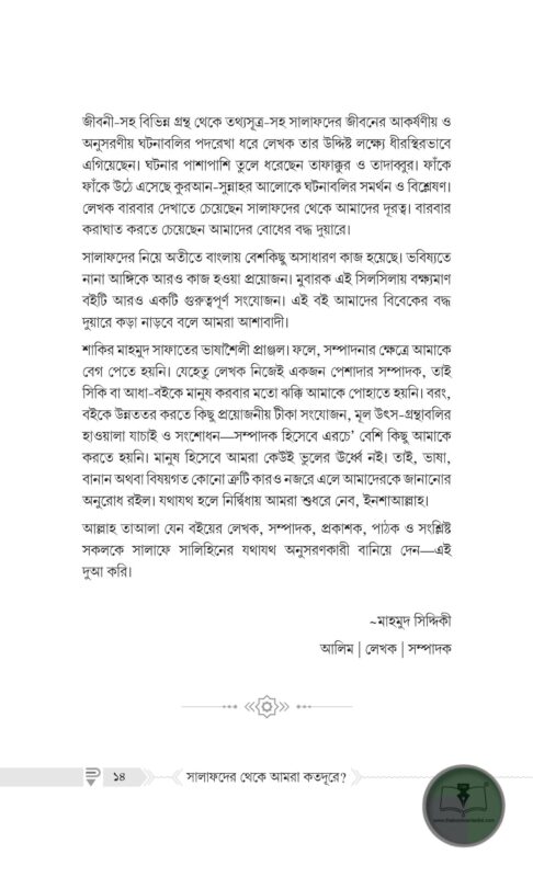 “সালাফদের থেকে আমরা কতদূরে?” বইয়ের পাতায় কিংবা কোনো লেকচার-বক্তব্যে যখন আমরা সালাফে সালিহিনের ঈমান-আমল-তাকওয়া-যুহ্দের গল্পগুলো পড়ি বা শুনি, তখন আমাদের দুনিয়ার প্রেমে আসক্ত মন প্রবঞ্চনা দেয়—“আরে তারা তো ছিলেন সাহাবা, তাবিয়ি, তাবে-তাবিয়ি; তাদের মতো কি আর আমরা হতে পারব?” অথচ, আমরা ভুলে যাই, আল্লাহ রব্বুল আলামিন আমাদেরকে সাহাবাদের মতো করেই ঈমান আনতে বলেছেন। রসূল সল্লাল্লাহু আলাইহি ওয়াসাল্লাম এ তিন প্রজন্মকেই আমাদের জন্য আদর্শ হিসেবে উল্লেখ করেছেন।সুতরাং, ব্যাপারটা তো এমন হওয়ার কথা ছিল যে, ঈমান-আমল-তাকওয়া-যুহ্দে হুবহু তাদের মতো না হলেও, অনুসারী হিসেবে অন্তত কাছাকাছি হবে আমাদের অবস্থান। কিন্তু আফসোস! এসব ক্ষেত্রে যেন তাদের থেকে আমাদের অবস্থানে যোজন যোজন দূরত্ব। ‘সালাফদের থেকে আমরা কতদূরে?’ বইটিতে সে-দূরত্বগুলোই তুলে ধরার চেষ্টা করেছেন লেখক। যাতে আমাদের ঘুমন্ত বিবেক জাগ্রত হয়। গাফিলতি ছেড়ে যাতে আমরা একটু সচেতন হতে পারি আসন্ন পরকালের ব্যাপারে। যেন দূরত্বগুলো ঘুচিয়ে, সালাফদের পথে চলে, জান্নাতের দিকে যেতে পারি জাহান্নামের কিনারা ছেড়ে।