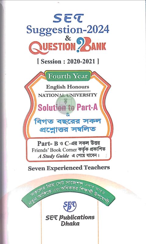 [Session: 2020-2021 ] Fourth Year English Honours NATIONAL UNIVERSITY Solution to Part-A & বিগত বছরের সকল প্রশ্নোত্তর সম্বলিত Part- B ও C-এর সকল উত্তর Friends’ Book Corner কর্তৃক প্রকাশিত A Study Guide এ পেয়ে যাবেন। Seven Experienced Teachers সকলের প্রিয় সেট সাজেশন্স এবার আরও নতুন আঙ্গিকে এবং অধিকতর শিক্ষার্থী উপযোগী SET Publications Dhaka