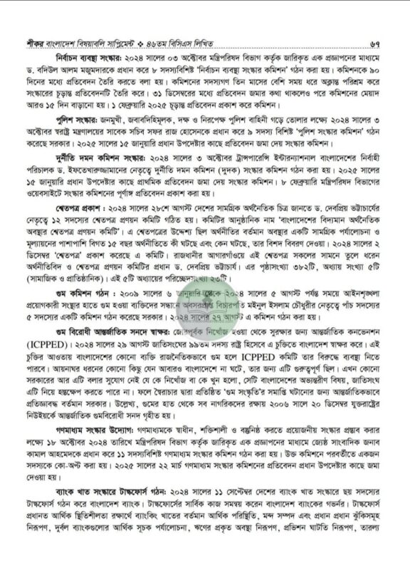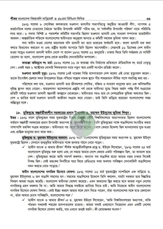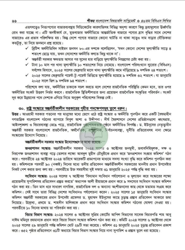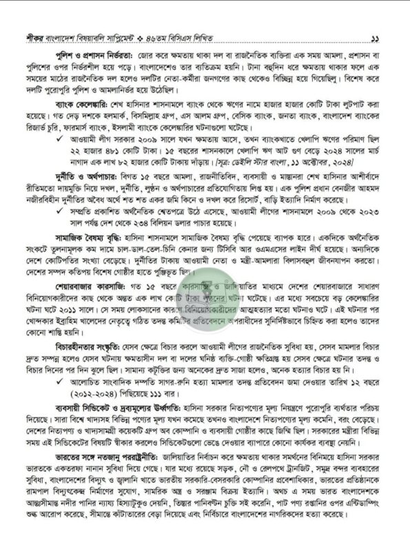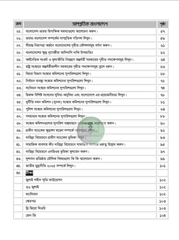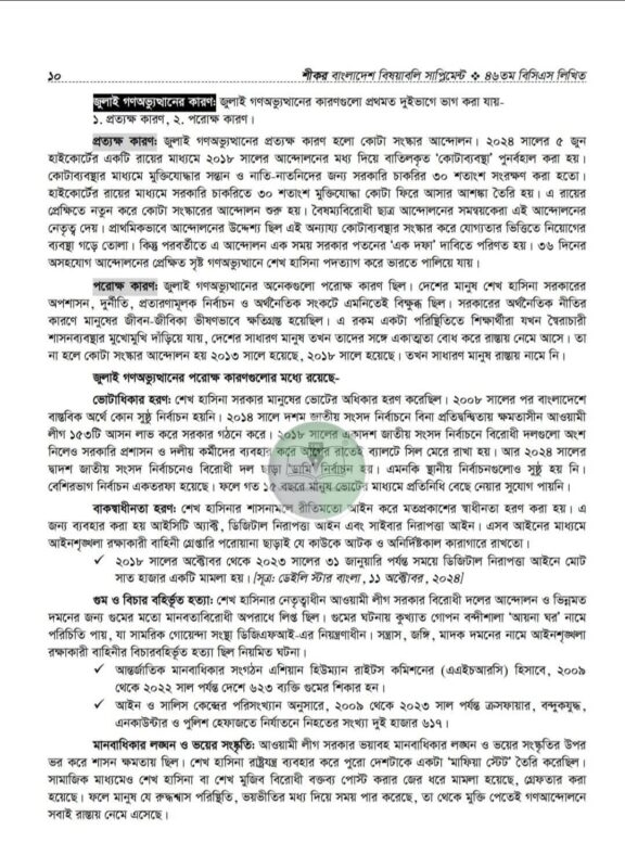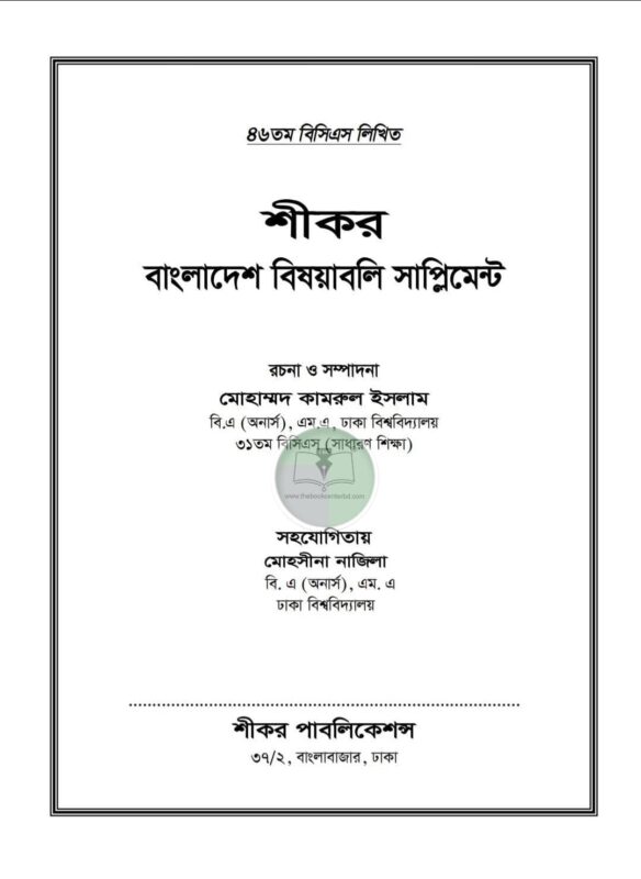 ৪৬তম বিসিএস লিখিত পরীক্ষার জন্য শীকর বাংলাদেশ বিষয়াবলি সাপ্লিমেন্ট by মোহাম্মদ কামরুল ইসলাম পরিবর্তিত পরিস্থিতির আলোকে বাংলাদেশ বিষয়াবলির জন্য গুরুত্বপূর্ণ সাম্প্রতিক ও আলোচিত টপিক নিয়ে বইটি সাজানো হয়েছে। কোটা সংস্কার আন্দোলন, জুলাই গণঅভ্যুত্থান, অন্তর্বর্তীকালীন সরকার, গণঅভ্যুত্থানের পর দেশের ইতিবাচক পরিবর্তন, আনুপাতিক নির্বাচন, জাতীয় সরকার, নির্দলীয় তত্ত্বাবধায়ক সরকার ব্যবস্থা পুনর্বহালের যৌক্তিকতা ইত্যাদি টপিক সম্পর্কে আলোচনা করা হয়েছে। গুরুত্বপূর্ণ ব্যক্তিত্ব সম্পর্কে আলোচনা করতে গিয়ে মুক্তিযুদ্ধে প্রধান উপদেষ্টা ড. মুহাম্মদ ইউনূসের ভূমিকা, স্বাধীন বাংলাদেশের অভ্যুদয়ে মওলানা ভাসানীর ভূমিকা, শেরে বাংলা এ কে ফজলুল হকের রাজনৈতিক জীবন সম্পর্কে আলোকপাত করা হয়েছে। পরিবর্তিত পরিস্থিতিতে অন্তর্বর্তীকালীন সরকারের পররাষ্ট্রনীতি, আসিয়ানকে ঘিরে বাংলাদেশের সম্ভাবনা, রোহিঙ্গাদের প্রত্যাবাসনে অন্তর্বর্তীকালীন সরকারের পদক্ষেপ, সাম্প্রতিক বাংলাদেশ-ভারত দ্বিপাক্ষিক সম্পর্ক, সীমান্ত নিরাপত্তা অর্জনে বাংলাদেশের গৃহীত কৌশল ইত্যাদি টপিক নিয়ে আলোচনা করা হয়েছে। রাষ্ট্র সংস্কারে অন্তর্বর্তীকালীন সরকারের সংস্কার উদ্যোগ, বিভিন্ন সংস্কার কমিশনের সুপারিশ এবং সুপারিশ বাস্তবায়নে চ্যালেঞ্জগুলো আলোচনা করা হয়েছে। রূপপুর পারমাণবিক বিদ্যুৎ কেন্দ্র ও রামপাল বিদ্যুৎ কেন্দ্রের পরিবেশগত দিকে নিয়েও আলোকপাত করা হয়েছে। এছাড়া গ্রামীণ ব্যাংকের ক্ষুদ্রঋণ মডেল, দারিদ্র্য বিমোচনে গ্রামীণ ব্যাংক ও এনজিওর ভূমিকা, সামাজিক ব্যবসায় সম্পর্কে আলোচনা করা হয়েছে। উল্লেখ্য, সাপ্লিমেন্ট পূর্ণাঙ্গ বই না। এটা মূল বইয়ের সম্পূরক বা পরিপূরক। এর মূল বই “শীকর বাংলাদেশ বিষয়াবলি”। মূল বইটি প্রকাশিত হওয়ার পর ঘটে যাওয়া সাম্প্রতিক গুরুত্বপূর্ণ টপিকগুলো সাপ্লিমেন্টে যোগ করা হয়েছে। দুএকটা টপিক মূল বইতে ছিল সাপ্লিমেন্টে আপডেটসহ যোগ করা হয়েছে।