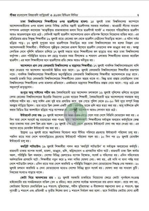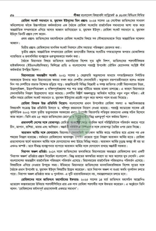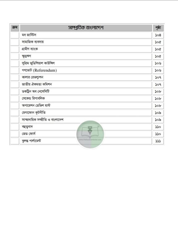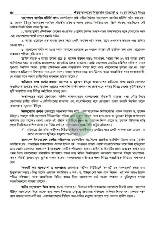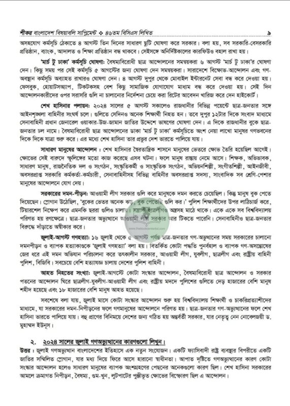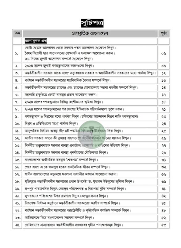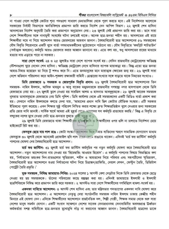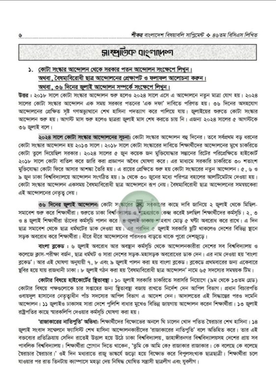 ৪৬তম বিসিএস লিখিত পরীক্ষার জন্য শীকর বাংলাদেশ বিষয়াবলি সাপ্লিমেন্ট by মোহাম্মদ কামরুল ইসলাম পরিবর্তিত পরিস্থিতির আলোকে বাংলাদেশ বিষয়াবলির জন্য গুরুত্বপূর্ণ সাম্প্রতিক ও আলোচিত টপিক নিয়ে বইটি সাজানো হয়েছে। কোটা সংস্কার আন্দোলন, জুলাই গণঅভ্যুত্থান, অন্তর্বর্তীকালীন সরকার, গণঅভ্যুত্থানের পর দেশের ইতিবাচক পরিবর্তন, আনুপাতিক নির্বাচন, জাতীয় সরকার, নির্দলীয় তত্ত্বাবধায়ক সরকার ব্যবস্থা পুনর্বহালের যৌক্তিকতা ইত্যাদি টপিক সম্পর্কে আলোচনা করা হয়েছে। গুরুত্বপূর্ণ ব্যক্তিত্ব সম্পর্কে আলোচনা করতে গিয়ে মুক্তিযুদ্ধে প্রধান উপদেষ্টা ড. মুহাম্মদ ইউনূসের ভূমিকা, স্বাধীন বাংলাদেশের অভ্যুদয়ে মওলানা ভাসানীর ভূমিকা, শেরে বাংলা এ কে ফজলুল হকের রাজনৈতিক জীবন সম্পর্কে আলোকপাত করা হয়েছে। পরিবর্তিত পরিস্থিতিতে অন্তর্বর্তীকালীন সরকারের পররাষ্ট্রনীতি, আসিয়ানকে ঘিরে বাংলাদেশের সম্ভাবনা, রোহিঙ্গাদের প্রত্যাবাসনে অন্তর্বর্তীকালীন সরকারের পদক্ষেপ, সাম্প্রতিক বাংলাদেশ-ভারত দ্বিপাক্ষিক সম্পর্ক, সীমান্ত নিরাপত্তা অর্জনে বাংলাদেশের গৃহীত কৌশল ইত্যাদি টপিক নিয়ে আলোচনা করা হয়েছে। রাষ্ট্র সংস্কারে অন্তর্বর্তীকালীন সরকারের সংস্কার উদ্যোগ, বিভিন্ন সংস্কার কমিশনের সুপারিশ এবং সুপারিশ বাস্তবায়নে চ্যালেঞ্জগুলো আলোচনা করা হয়েছে। রূপপুর পারমাণবিক বিদ্যুৎ কেন্দ্র ও রামপাল বিদ্যুৎ কেন্দ্রের পরিবেশগত দিকে নিয়েও আলোকপাত করা হয়েছে। এছাড়া গ্রামীণ ব্যাংকের ক্ষুদ্রঋণ মডেল, দারিদ্র্য বিমোচনে গ্রামীণ ব্যাংক ও এনজিওর ভূমিকা, সামাজিক ব্যবসায় সম্পর্কে আলোচনা করা হয়েছে। উল্লেখ্য, সাপ্লিমেন্ট পূর্ণাঙ্গ বই না। এটা মূল বইয়ের সম্পূরক বা পরিপূরক। এর মূল বই “শীকর বাংলাদেশ বিষয়াবলি”। মূল বইটি প্রকাশিত হওয়ার পর ঘটে যাওয়া সাম্প্রতিক গুরুত্বপূর্ণ টপিকগুলো সাপ্লিমেন্টে যোগ করা হয়েছে। দুএকটা টপিক মূল বইতে ছিল সাপ্লিমেন্টে আপডেটসহ যোগ করা হয়েছে।