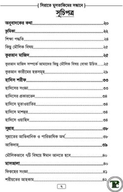 সিরাতে মুসতাকিমের সন্ধানে বইটি ৪০টি পাঠ নিয়ে গঠিত প্রতিটি পাঠে পাচটি মুল বিষয়ে আলোচনা করা হয়েছে