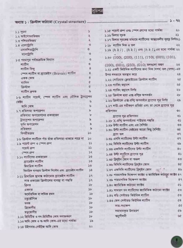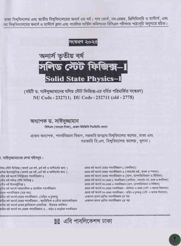 “সলিড টেস্ট ফিজিক্স-১” অনার্স পদার্থবিজ্ঞান বিভাগের শিক্ষার্থীদের জন্য পদার্থবিজ্ঞানের মৌলিক ধারণা থেকে শুরু করে ক্রিস্টাল এবং অক্রিস্টাল পদার্থের কাঠামো ও ধর্ম পর্যন্ত বিস্তারিতভাবে ব্যাখ্যা করা একটি পূর্ণাঙ্গ পাঠ্যবই। প্রখ্যাত লেখক ড. সাঈদুজ্জামান রচিত এই বইটি ২০২৫ সালের New Edition হিসেবে বর্তমান সিলেবাস অনুযায়ী সাজানো হয়েছে। বইটিতে পদার্থ, বস্তু, কণা, কঠিন, তরল এবং গ্যাসীয় অবস্থাসহ পদার্থের মৌলিক বৈশিষ্ট্য সহজ ভাষায় উপস্থাপন করা হয়েছে। ক্রিস্টালবৎ এবং অ-ক্রিস্টালবৎ পদার্থের পার্থক্য, মৌল কণা, এবং ক্রিস্টালোগ্রাফি সম্পর্কিত ধারণা শিক্ষার্থীদের জন্য চিত্রসহ ব্যাখ্যা করা হয়েছে, যা জটিল তত্ত্বগুলো সহজে উপলব্ধি করতে সাহায্য করে। প্রতিটি অধ্যায়ে উদাহরণ, চিত্র ও প্রাক্টিক্যাল নোট সংযোজন করা হয়েছে, যা শিক্ষার্থীদের পরীক্ষার প্রস্তুতি ও ধারণা দৃঢ় করতে সহায়ক। বইটি অনার্স পদার্থবিজ্ঞানের ছাত্রছাত্রীদের জন্য মৌলিক অধ্যয়ন এবং পরীক্ষায় সফলতার জন্য একটি অপরিহার্য গ্রন্থ। যারা পদার্থবিজ্ঞানের প্রাথমিক ও মধ্যবর্তী বিষয়গুলো Bangla ভাষায় চিত্রসহ, পরীক্ষাভিত্তিক এবং সহজভাবে জানতে চান—তাদের জন্য “সলিড টেস্ট ফিজিক্স-১” একদম উপযুক্ত।