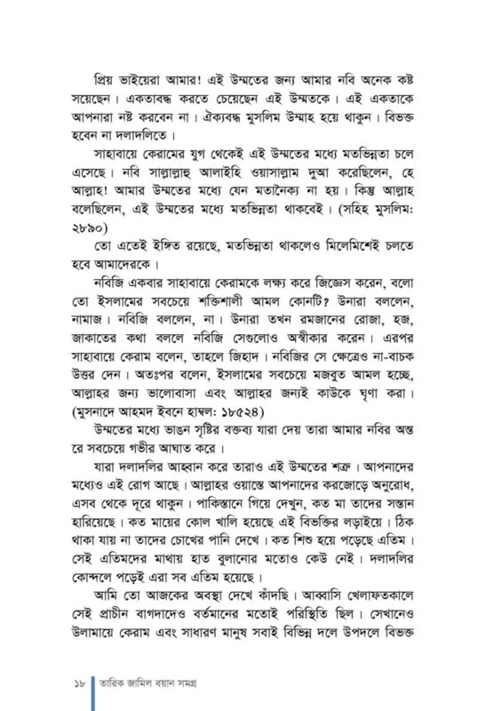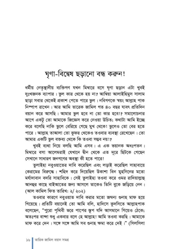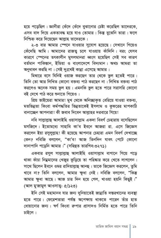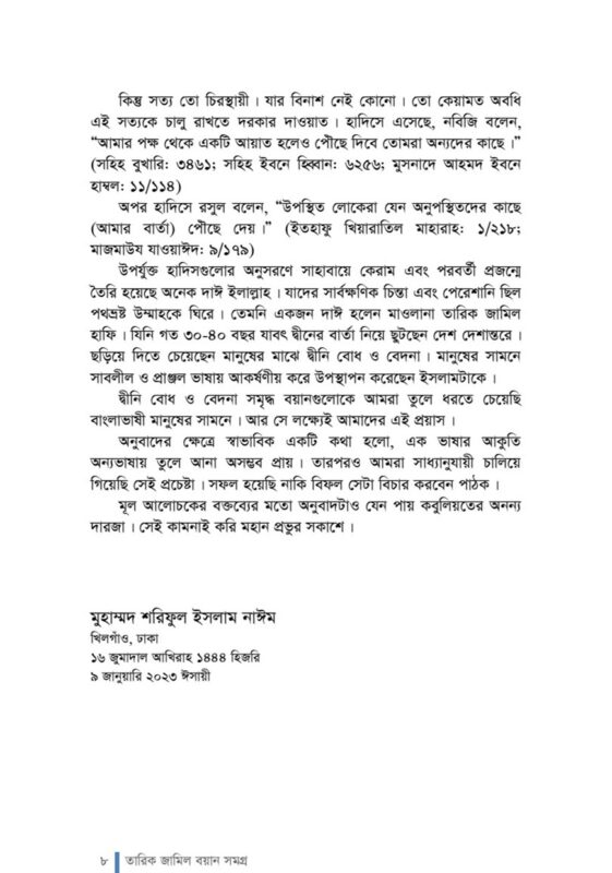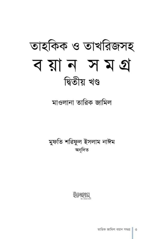 “তাহকিক ও তাখরিজসহ বয়ান সমগ্র ২য় খন্ড” জীবন বদলে দেয়ার মতো বই!বর্তমান সময়ের জনপ্রিয় বক্তা মাওলানা তারিক জামিল হাফিজাহুল্লাহ। দুই যুগের বেশি সময় ধরে তিনি পৃথিবীর নানান দেশে আলোচনা করছেন। পৃথিবীর হাজারো মানুষ নিজেকে বদলে ফেলেছে তাঁর আলোচনা শুনে। তারা আবেগাপ্লুত, দরদমাখা আলোচনা লাখো তরুণের মনে আশা জাগায়। তারা ইসলাম নিয়ে জানতে আগ্রহী হয়, রাসূলুল্লাহ সাল্লাল্লাহু আলাইহি ওয়া সাল্লামের সুন্নাহ পালনে উৎসাহ পায়।মাওলানা তারিক জামিলের লেকচারগুলো রেফারেন্সসহ দুই খণ্ডে প্রকাশ করেছে ইলহাম।দুই খণ্ডের বইটি প্রত্যেকের বাসায় রাখার মতো। মন খারাপ? বইটি পড়া শুরু করুন। কাউকে গিফট দিতে চান? তারিক জামিলের বয়ান সমগ্র দিতে পারেন। এই বইটি একজন মানুষের জীবন বদলে দিতে পারে। আপনাকে হাসাবে, আপনাকে কাঁদাবে।