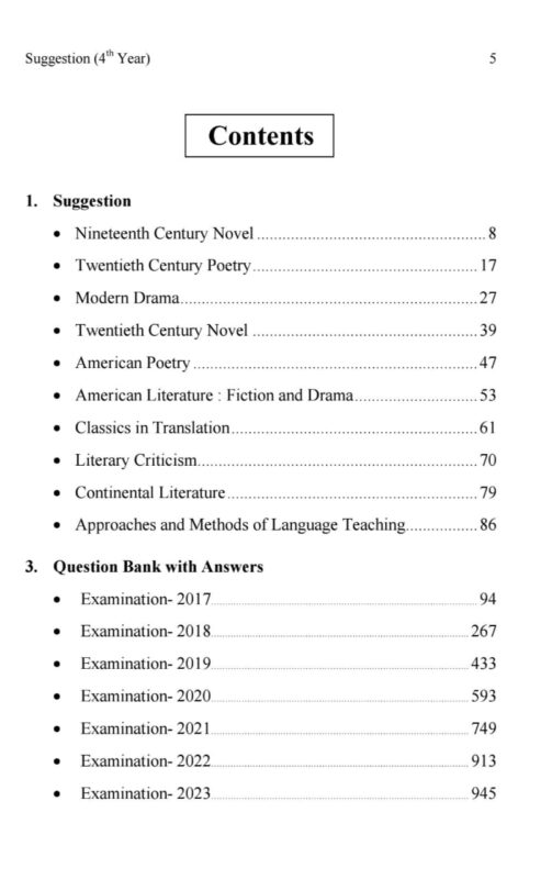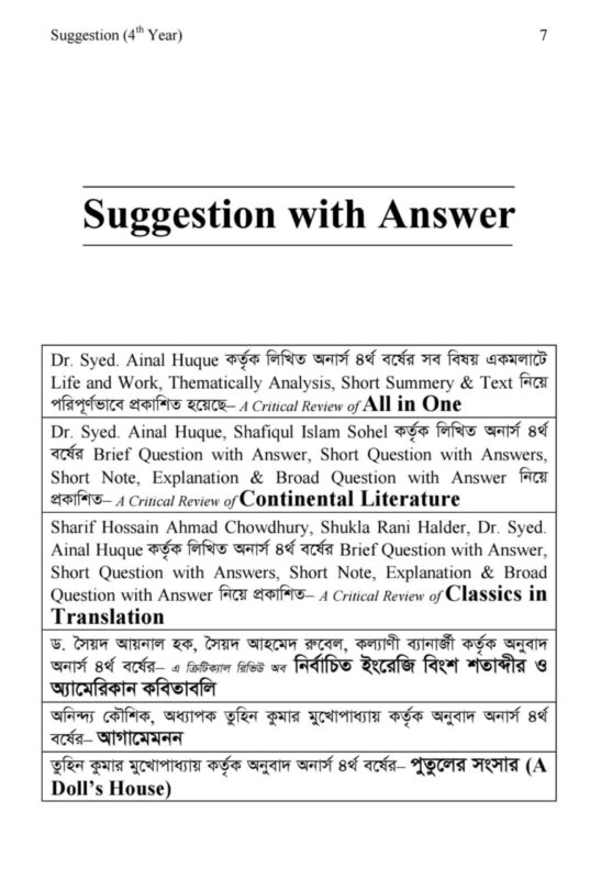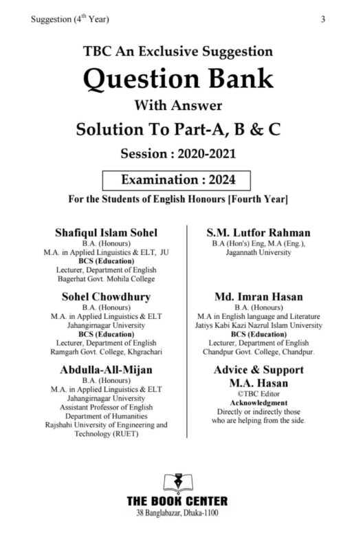 ৪র্থ বর্ষের ইংরেজি বিভাগের শিক্ষার্থীদের জন্য একটি অত্যন্ত গুরুত্বপূর্ণ সহায়ক একটি বই। বইটি এবারের পরিক্ষার্থীদের জন্য পূর্ণাঙ্গ প্রস্তুতির হাতিয়ার হিসেবে কাজ করবে। বইটি বিগত বছরের গুরুত্বপূর্ণ প্রশ্নপত্রের ভিত্তিতে তৈরি করা হয়েছে। বইটিতে সিলেবাসে থাকা ১০টি সাবজেক্ট নিয়ে বিষয়ের সুবিন্যস্তভাবে সাজানো হয়েছে। যা ২০২৪ সালের শিক্ষার্থীদের পরীক্ষার ধরণ সম্পর্কে স্পষ্ট ধারণা দেবে। বইটিতে শুধুমাত্র প্রশ্ন নয়, বরং সঠিক উত্তর কৌশল, সময় ব্যবস্থাপনা এবং প্রাসঙ্গিক লেখার দৃষ্টিভঙ্গি সম্পর্কেও পরামর্শ দেওয়া হয়েছে। ভাষা ও কাঠামোর সরলতা শিক্ষার্থীদের জন্য উপকার হবে। কঠিন বিষয়গুলো সহজভাবে উপস্থাপন করা হয়েছে, যা বোঝার ক্ষেত্রে সহায়তা করে। এই বইটি অধ্যয়ন করলে শিক্ষার্থীরা কোন কোন বিষয়ে বেশি মনোযোগ দিতে হবে তা বুঝতে পারবেন। ইংরেজি চতুর্থ বর্ষের পরীক্ষার সিলেবাস বিশ্লেষণ করে তৈরি হওয়ায় এটি শিক্ষার্থীদের ফলাফল উন্নত করতে সাহায্য করবে। সঠিক দিকনির্দেশনার ফলে পরীক্ষার আগে আত্মবিশ্বাস বাড়বে। সঠিক দিকনির্দেশনার ফলে পরীক্ষার আগে আত্মবিশ্বাস বাড়বে।।