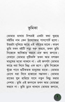 তোমার মাথায় নিশ্চয়ই একটা কথা ঘুরছে বইটির নাম কেন উদ্যোক্তার পাসপোর্ট হলো। উত্তরটা লুকিয়ে আছে এই বইয়ের মাঝে। কারণ তুমি যখন বইটি পড়া শুরু করবে, তখন তুমি নিজেকে আবিষ্কার করবে এক অন্য জগতে। যেখানে তোমার দৃষ্টিভঙ্গি তখন আর দশজন মানুষের মতো থাকবে না। এই জগৎটা তোমার কাছে ধরা দিবে ভিন্ন এক রূপে। তুমি নিজেকে খুঁজে পাবে গুটিকতক মানুষের মাঝে। তোমার চোখে ধরা দিবে হাজারো সম্ভাবনা। তোমার রাতের ঘুম হারিয়ে যাবে নতুন কিছু করার নেশায়। তুমি এই জগৎকে তখন আর তোয়াক্কা করবে না। তুমি ডুবে থাকবে তোমার জগতে, এই জগতে কারো রাজ চলে না। এখানে রাজা শুধু তুমি, তুমি নিজেকে নিয়ে যেতে পারো অসীমে আবার তুমি নিজেকে ধ্বংস করে দিতে পারো। সবকিছু নির্ভর করবে তোমার ওপর। বইটি তোমাকে শুধু পথ দেখাবে, কিন্তু সেই পথে তোমাকেই হাঁটতে হবে। উদ্যোক্তার জগতে তোমাকে স্বাগতম, চলো যাত্রা শুরু করি।
